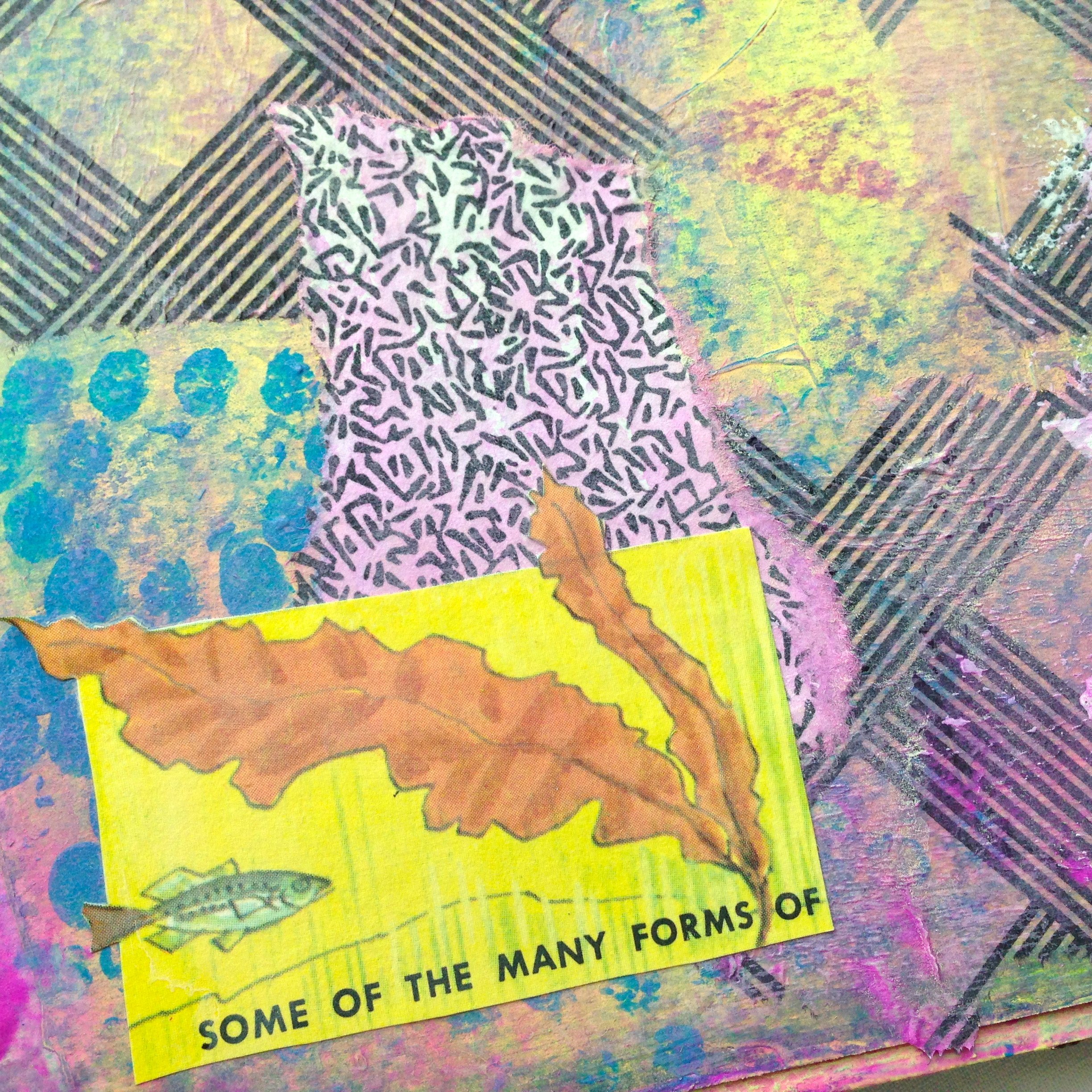 The first layer is just a wash of light green paint. Then I scraped pastels in green, pink, purple, blue, and yellow on their sides to cover more area. I stamped over that with bubble wrap dipped in aqua paint, let that dry, then added the geometric tissue and pieces of an envelope. When that was dry, I stenciled with gesso and a sea sponge, then went over that with a wash of tinted gesso*. For someone that doesn’t like to paint very much, I sure went to town!