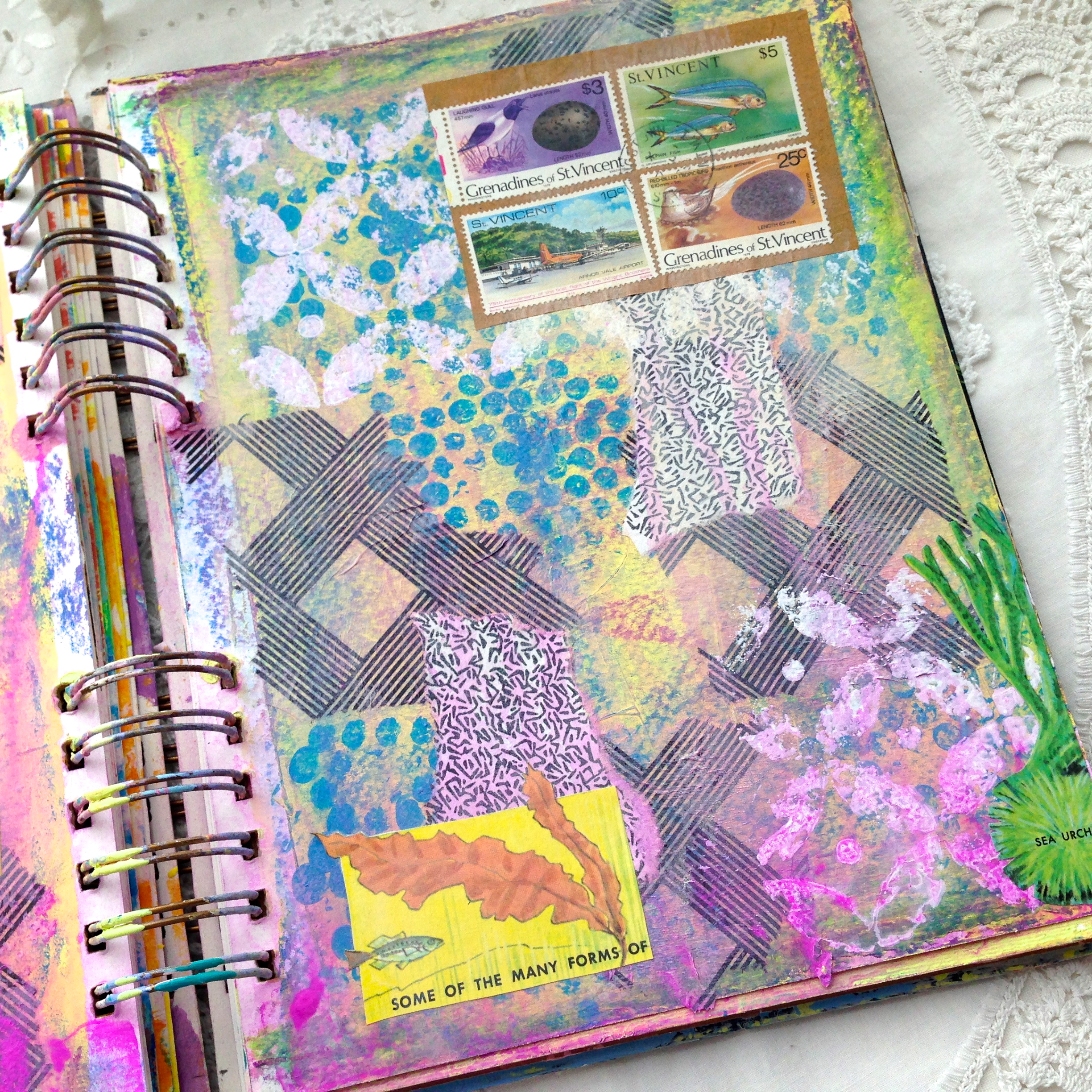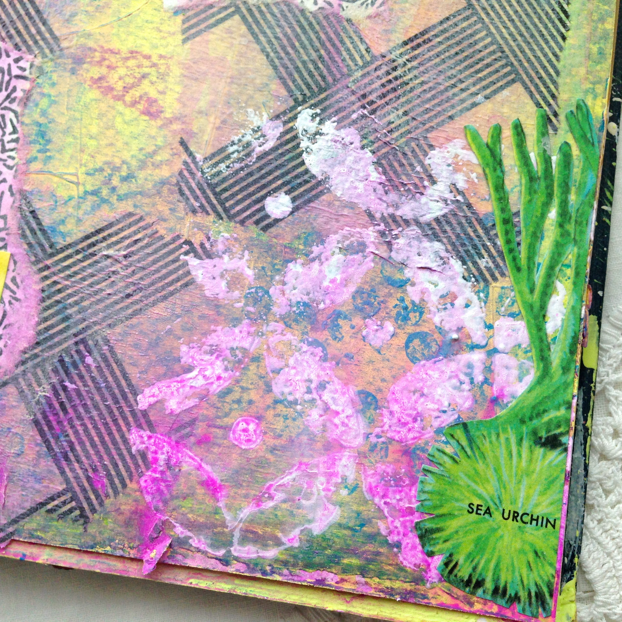 When that layer dried, I added the images from a vintage book on the sea and some postage stamps from abroad. They kind of stuck out like a soar thumb, so I went over the images and stamps with a coat of tinted gesso*. As you can see, I still love fussy cutting my images, it makes them seem like a more organic part of the page than just cutting out a square.