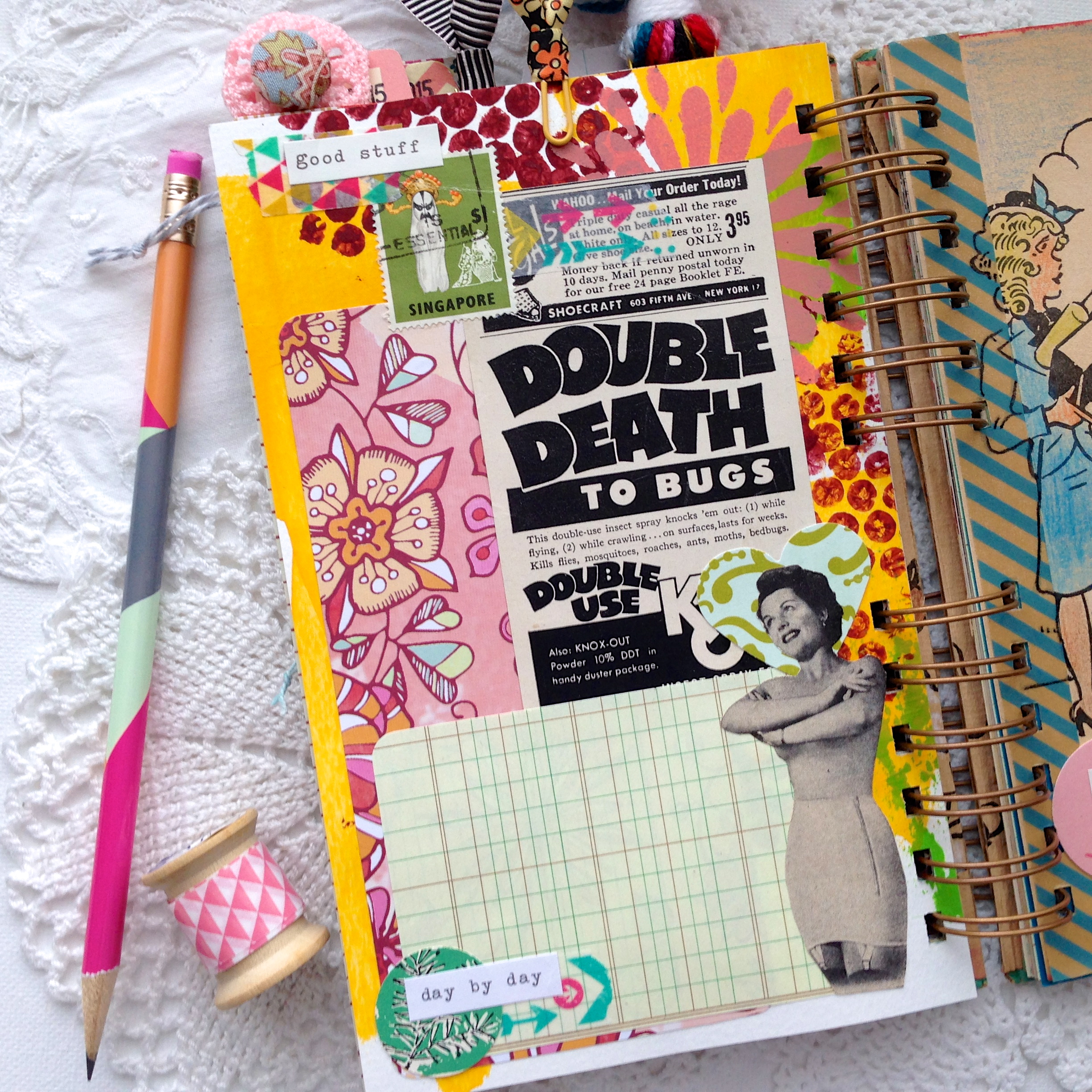 The black and white ephemera is a great way to calm down an extremely loud back ground! And I personally feel that if I was strapped into one of those girdle contraptions, I would want to kill more than bugs!