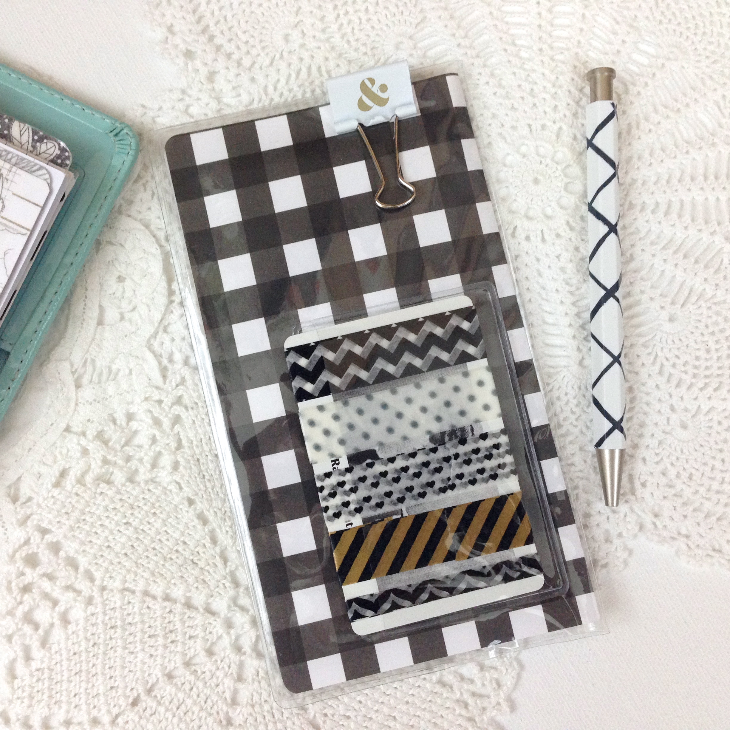 This is the plastic cover from an inexpensive pocket calendar. I took out the calendar and slipped in this coordinating paper. I used an adhesive business card holder to hold this washi taped playing card. I can never have enough washi on hand!