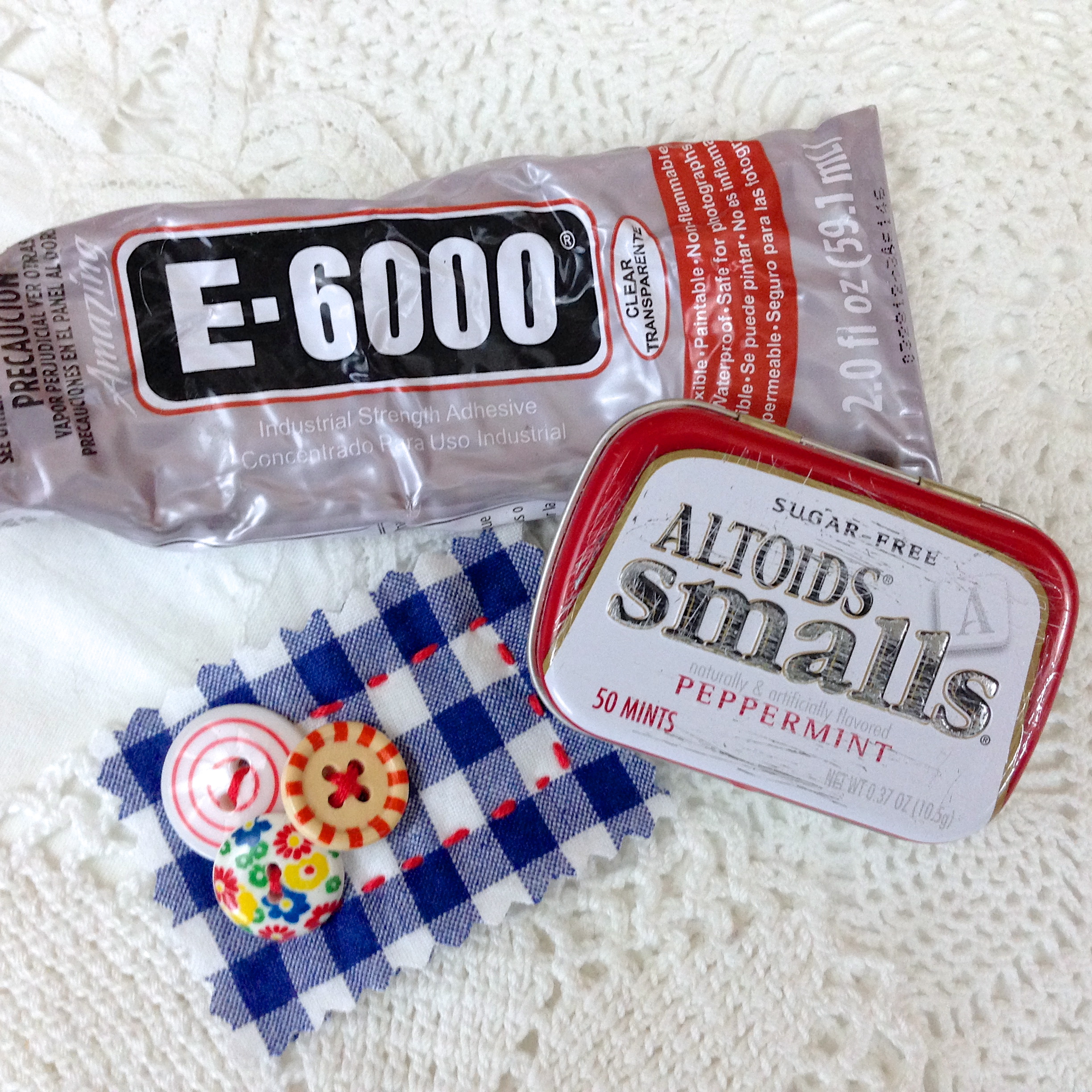 Supplies: an Altoids “Smalls” tin, embroidery thread, embroidery needle, scissors, a 2″x3″ piece of quilt batting, 2- 3″x4″ fabric scraps, multi-surface glue, assorted buttons or flare button, sand paper, and pinking shears (optional).