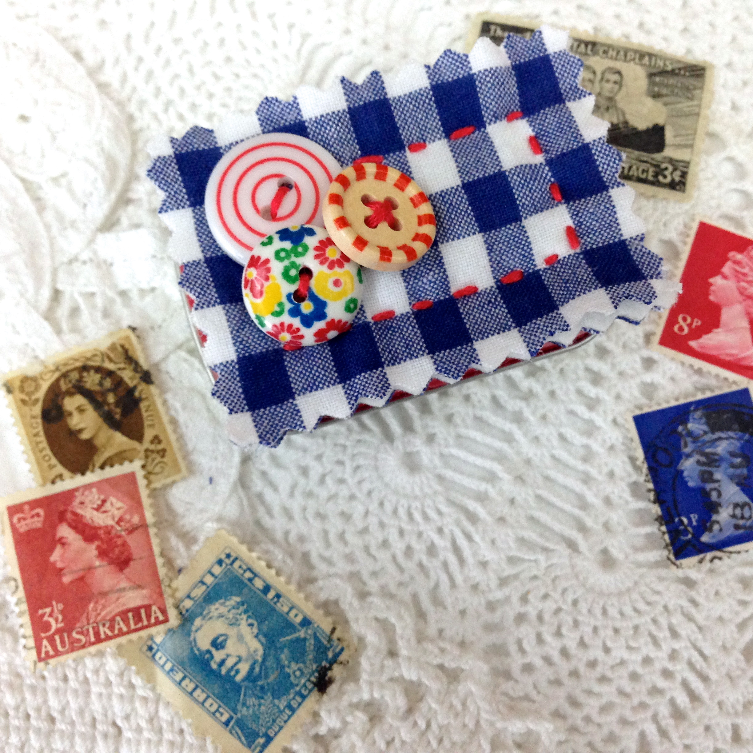 Sew the buttons on then cut around the edges to fit the size of the tin top. Give the top of the tin a bit of a sanding to give it “tooth” for the glue to hold on to. Apply the glue and adhere the quilted bit to the top of the tin.