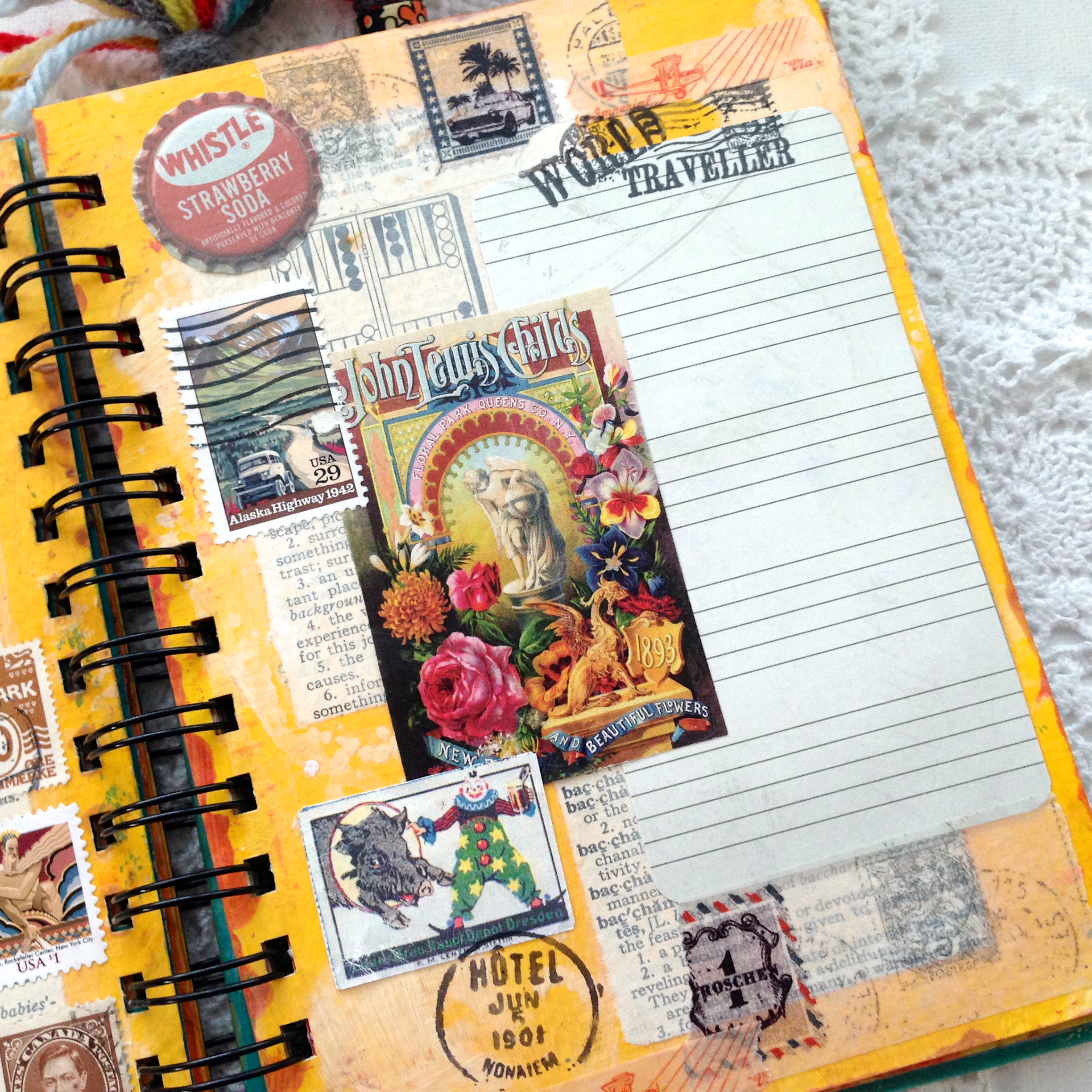 I replaced the journal pieces, then began filling it with washi tape, more postage stamps, and ink stamping. Now, I wish I had taken some before and afters, there really is a difference!