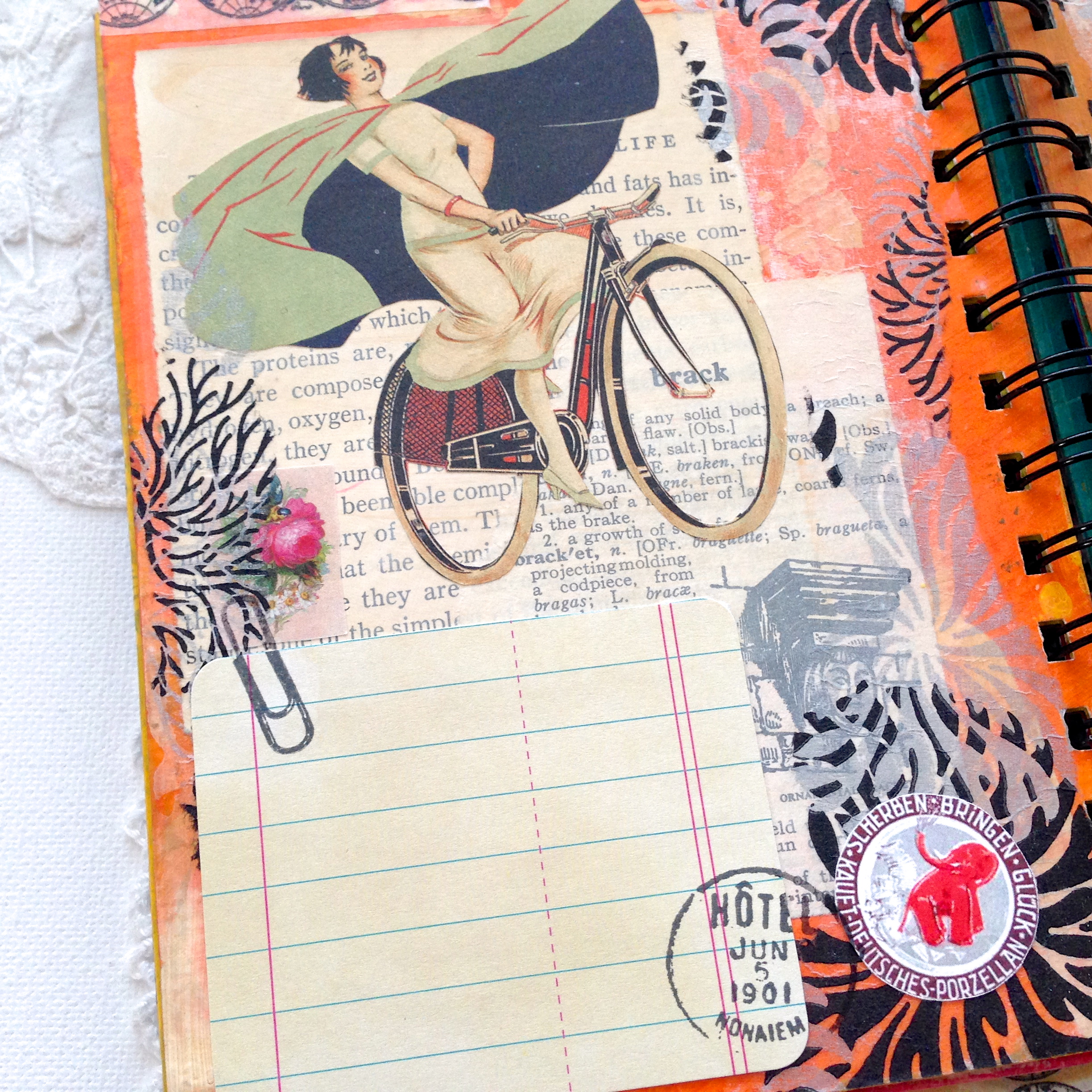 I love how the stamping subtly blends the journal piece into the background, exactly what I have been wanting to accomplish for a long time, but was to critical about my stamping abilities to try. I guess it took a “lost cause” project to give me the courage to throw caution to the wind!