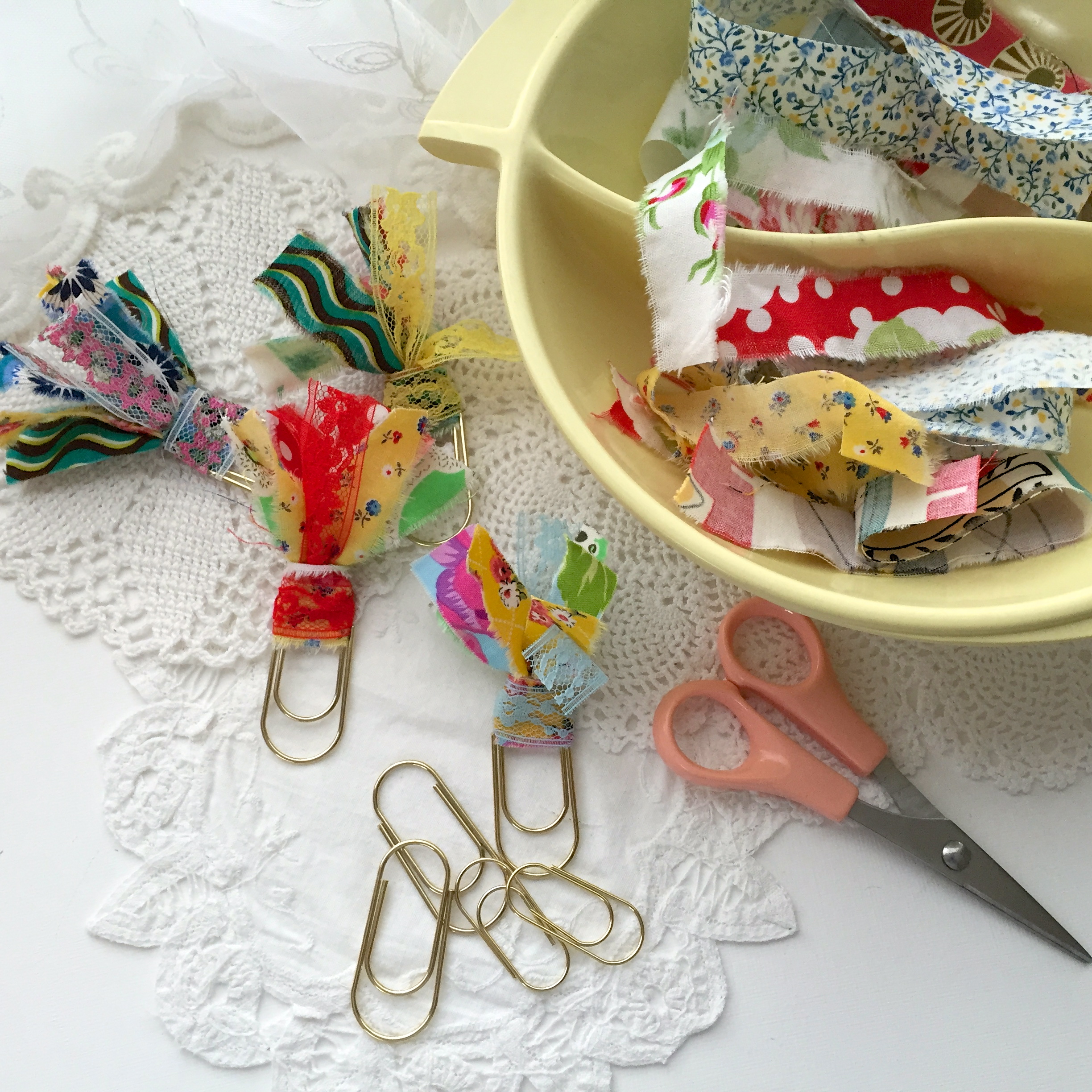 This is something I whipped up the other night, Love! I have so many fabric scraps, and I love working with scraps of all kinds as you may well know. The problem with getting some of these into the shoppe is finding those chunky paperclips. I shall be hunting some down today!