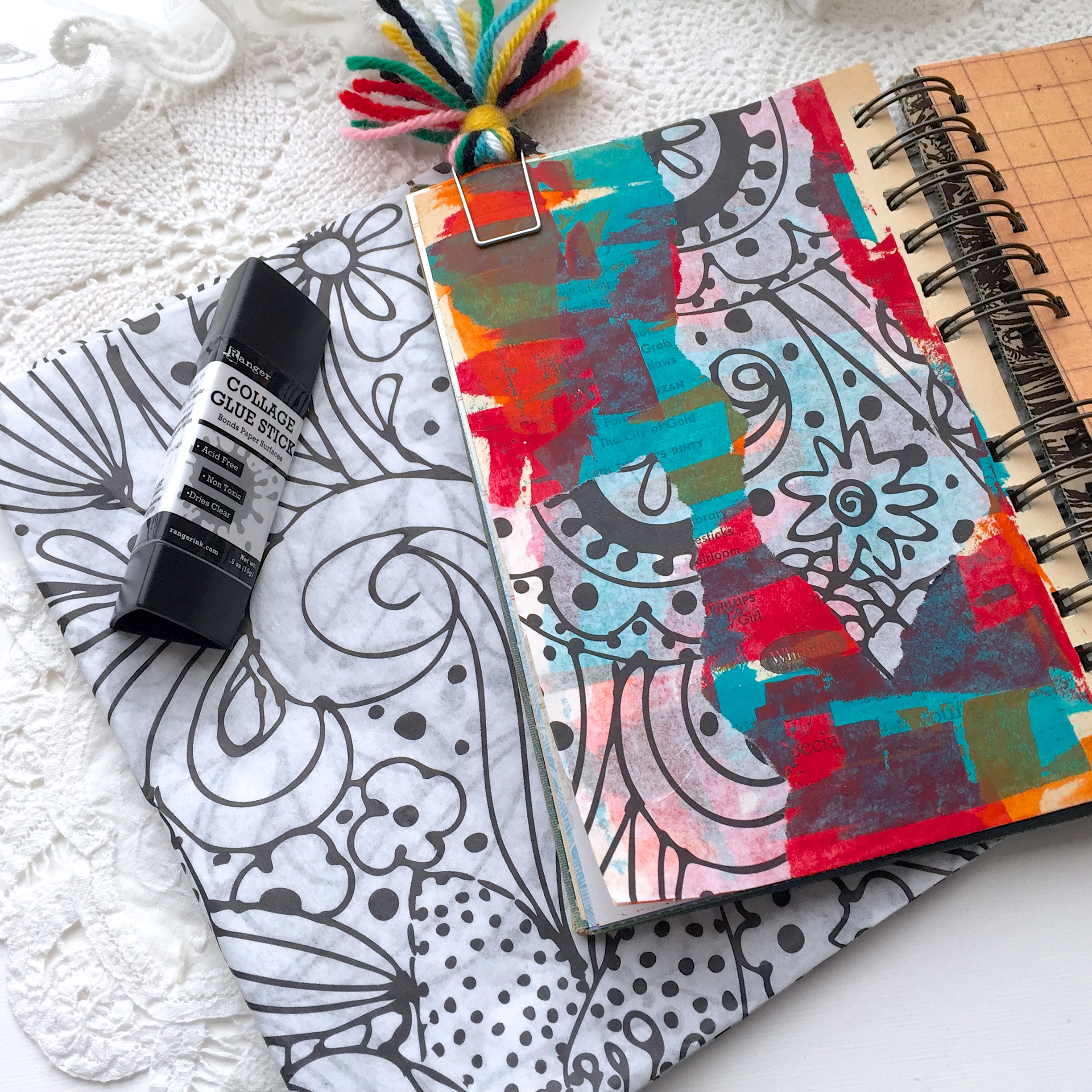 And a new way to apply tissue for me. I usually use matte medium, which takes a while to dry. A glue stick works well too, but you don’t get the same depth of color through the tissue paper as you would by saturating it with liquid adhesive, but it’s still a nice addition to the page. I’m going to try adding the tissue first, then the pigment next time.IMG_3097