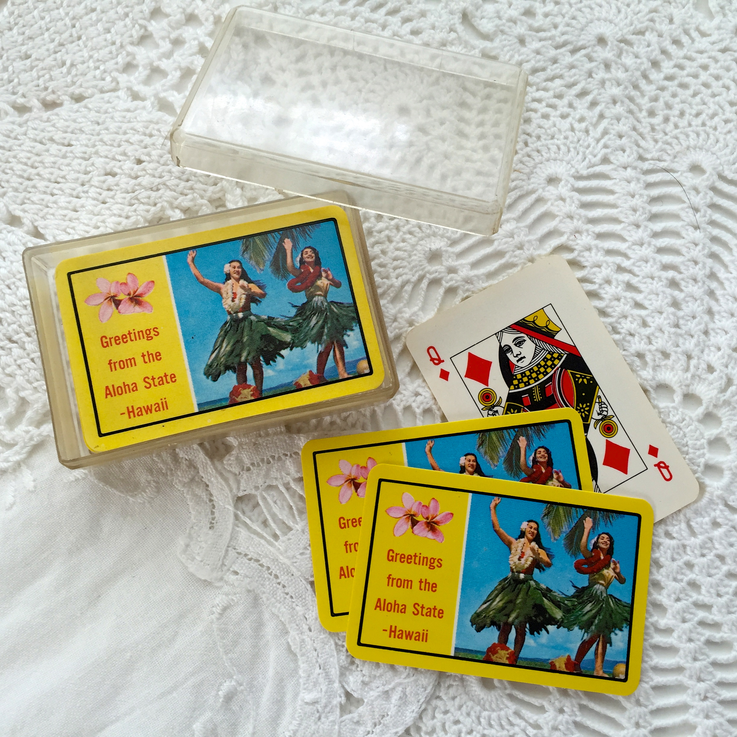 Then there are these, some super tiny playing cards. When I bought these they were taped up and just the card facings were showing. So, imagine my surprise and delight when I opened them up and found these retro hula girls on the covers! Yowzza!