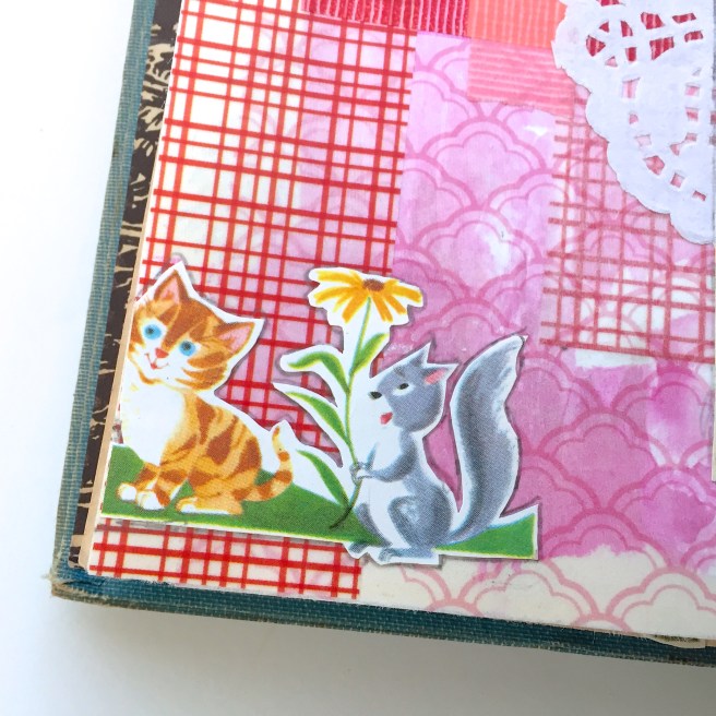 I strengthened this page with a layer of gesso, paint scrapes, and washi sheets I picked up at Michaels a few years ago, also some skinny washi down the spine. I decorated with washi tape, a doily, and images. There is definitely room to journal, so I may go back and do that later. This is an image I pulled from a journal I took apart. I won’t go into the type of journal, just that it wasn’t my style. Waste not, want not I say.