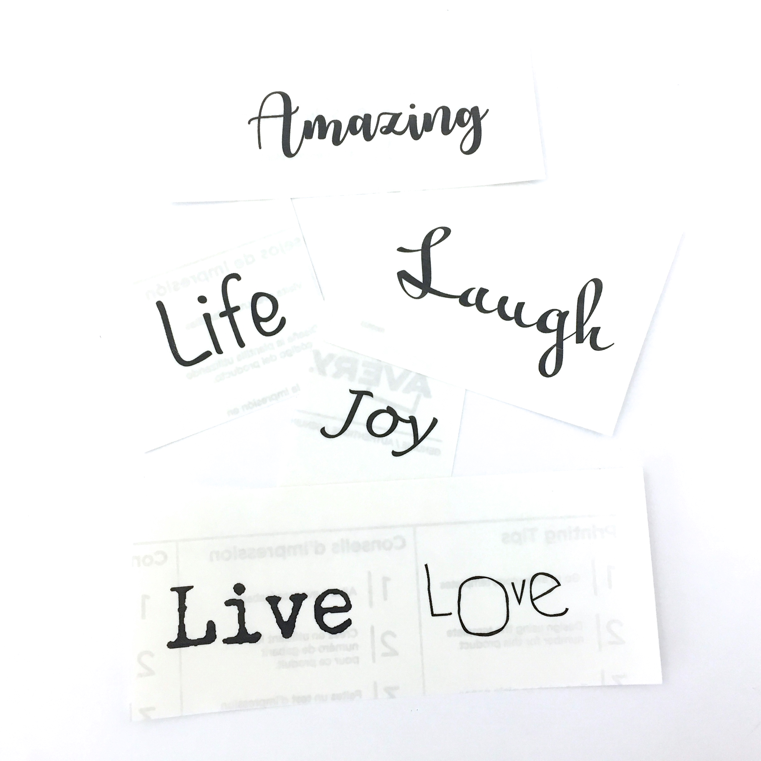 I made a few sheets of these by googling “positive words” and writing them in ‘Word’ with fonts I really liked, then printed them up on Avery 8665 clear sticker paper.