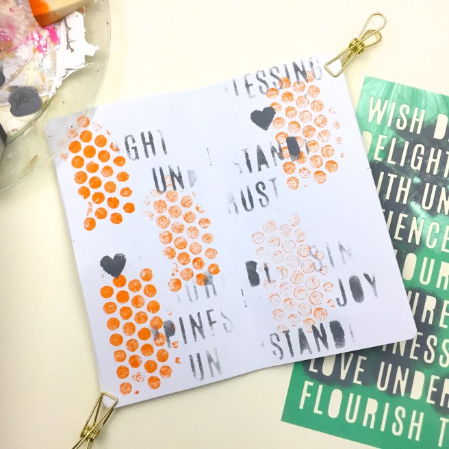 Either I use this little bubble wrap stamp, paint scrapes, or stenciling as the first layer. I use a makeup sponge to apply the paint to the stamp so it doesn’t get too goopy (I’m pretty sure that’s a word).