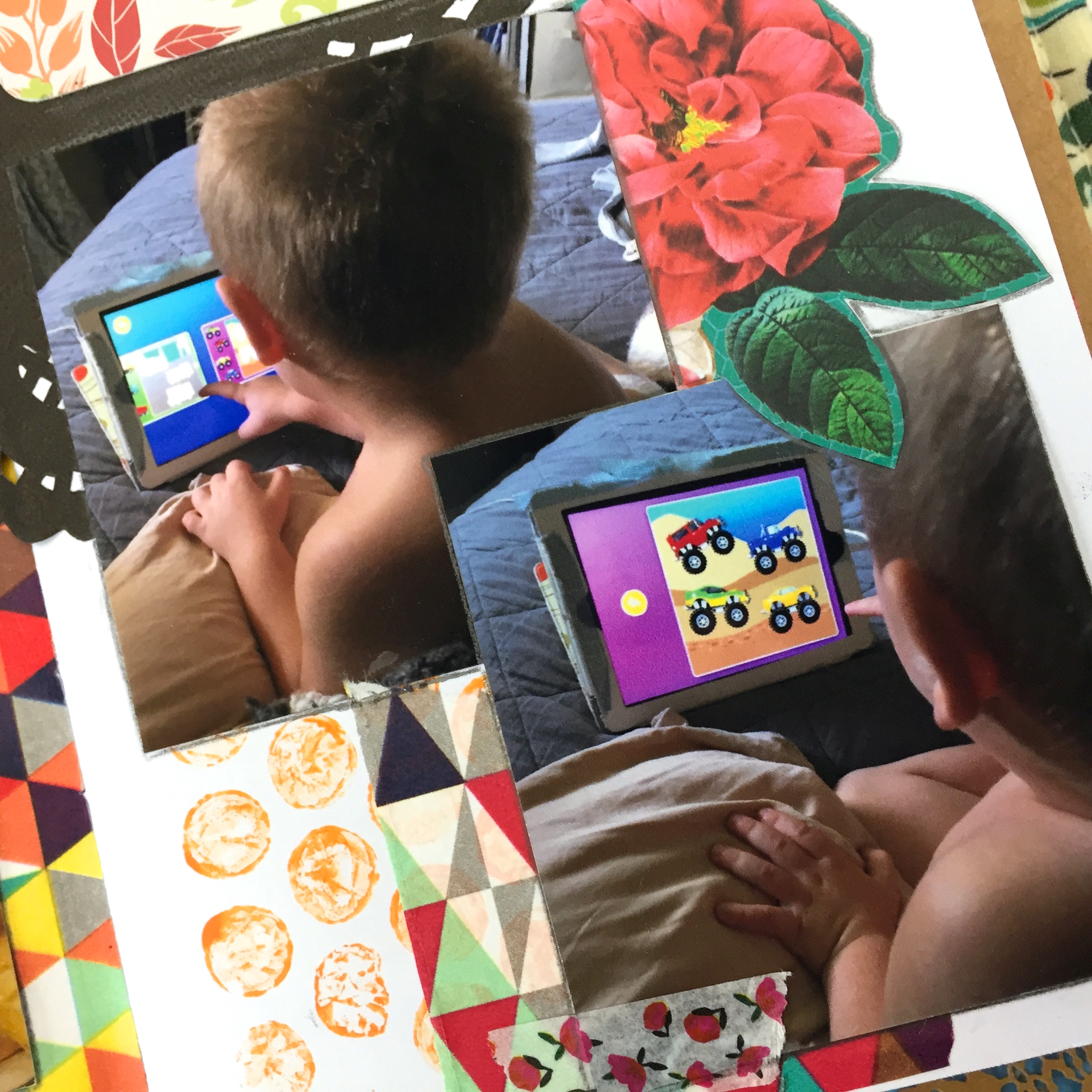 A photo of relaxing in the back yard with wine, business cards from restaurants we ate at, and photos of my grandson playing learning games on my iPad.