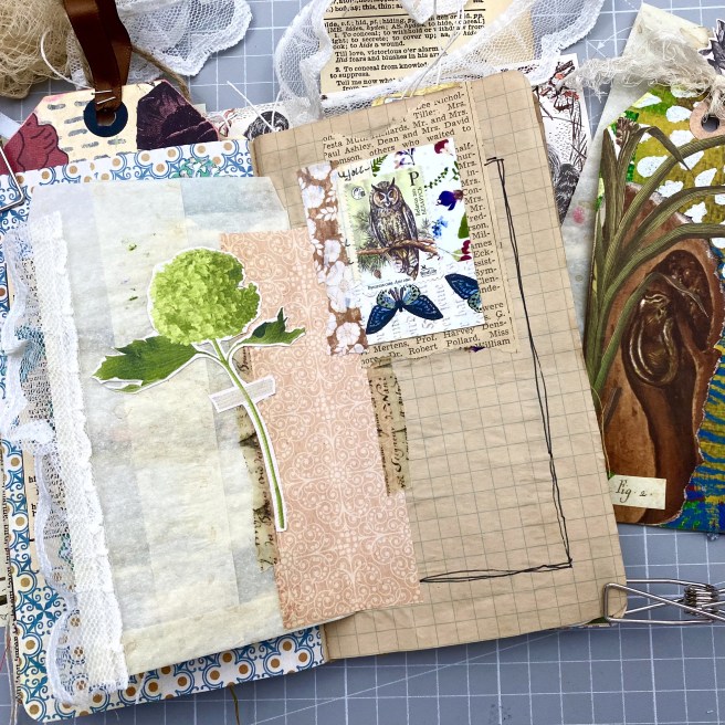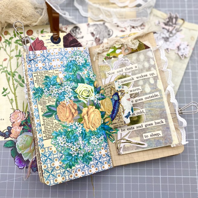 I made this little envelope from some coffee dyed bakers parchment paper, (that’s a mouthful!). Please comment below if you would like a process post for the envelope, that might be fun. It was a bit fiddly to put together, but I love how it turned out. I decorated it with the words from the chipmunk’s book page, added a botanic image and some lace I inherited from my mom’s stash.