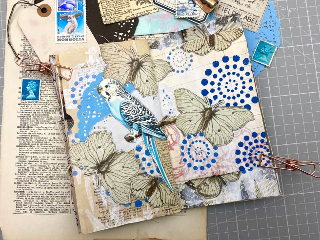 These birds inspired my color choice, I absolutely love that parakeet! I prepped the page with gesso then stenciled the geometric dots in gradations of blue paint across the page. I used the neutral moths? butterflies? to fill in space… and annoy the birds.