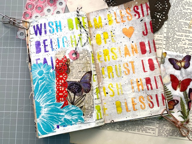 I had so much fun with the paint gradations on the “One Colour” page, I experimented with rainbow colors across this one, using a stencil of random words, then did a few black paint splatters.