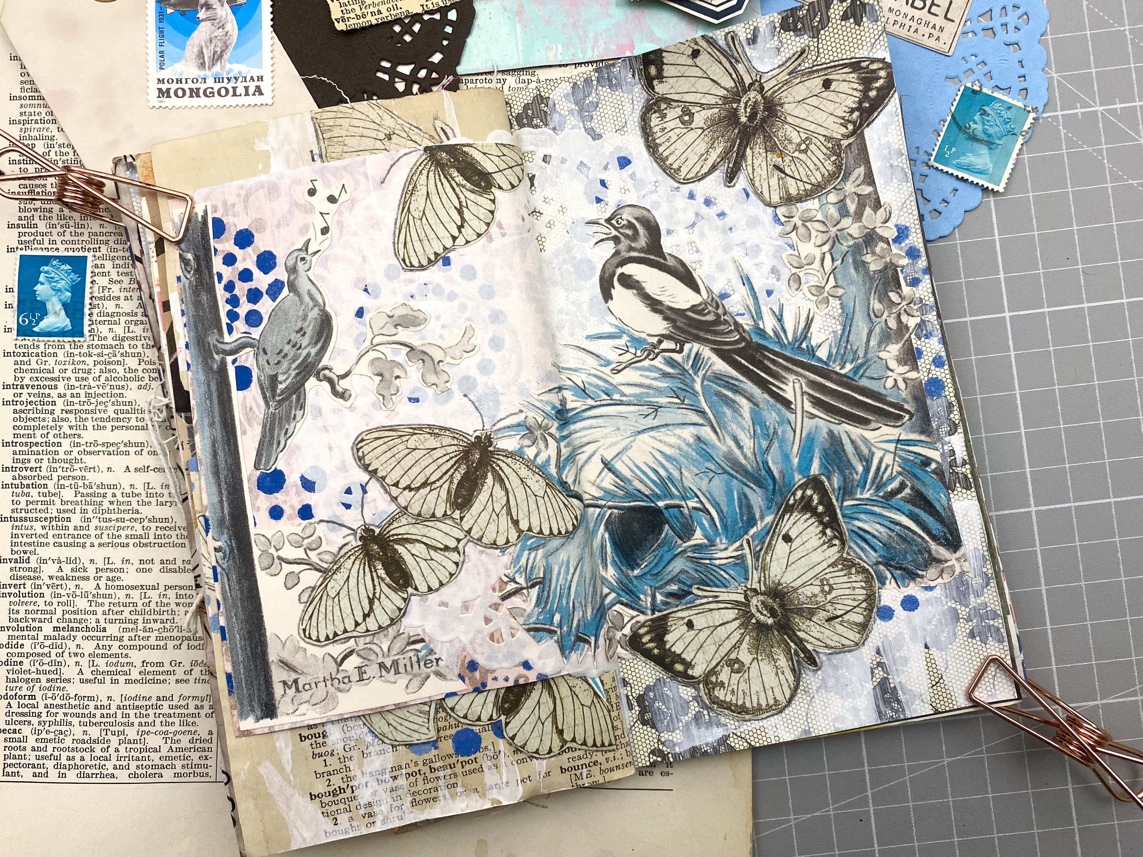 These birds inspired my color choice, I absolutely love that parakeet! I prepped the page with gesso then stenciled the geometric dots in gradations of blue paint across the page. I used the neutral moths? butterflies? to fill in space… and annoy the birds.