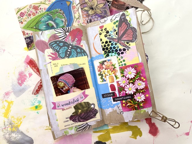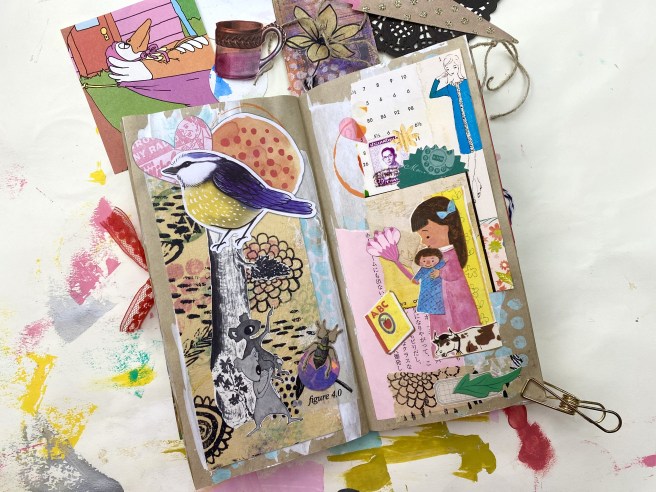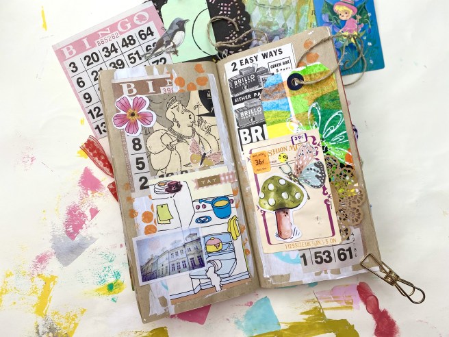 I consider using up years worth of junk journal supplies, and finishing up journals, as part of my de-clutter project. (If you have any theories on why I can’t throw small bits of paper away, please leave a comment below!) So to me, I’m accomplishing something when I finish a page spread.