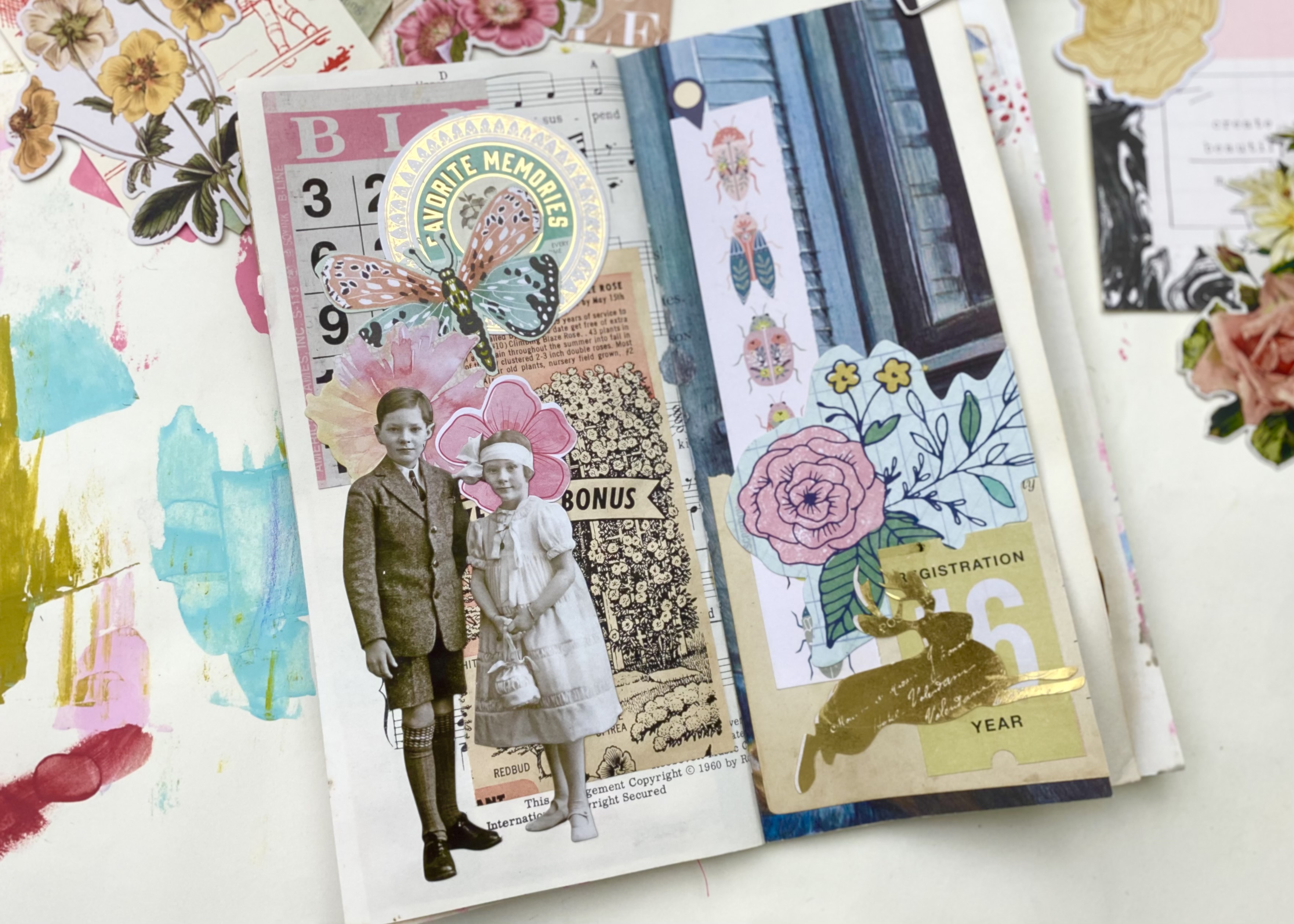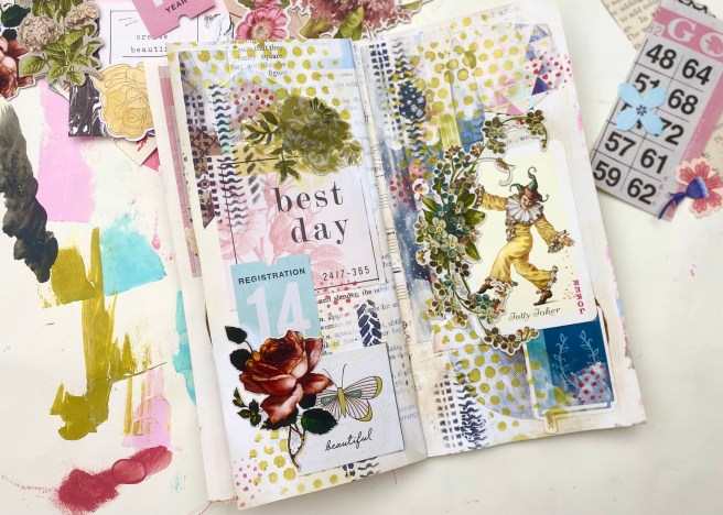 I am happy to say that my box of randomness is getting pretty empty and I’m starting to get into some of my better quality ephemera again. I guess I could just throw stuff away instead of trying to find ways to use it, but I l clearly enjoy a challenge!