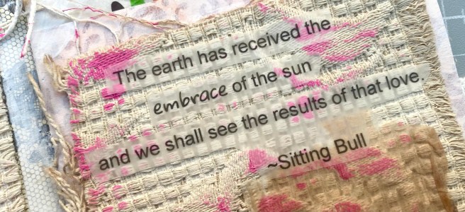 I looked in my fabric stash remembering this upholstery fabric from years ago, it has a great raised weave. On the first page spread I painted the fabric with gesso and scraped a little paint over the raised bits. On the second page spread, I adhered tissue paper and pressed it into the weave to enhance it. Both of these pages are very experimental for me, I’ve been trying to get back into my more “artistic” roots lately