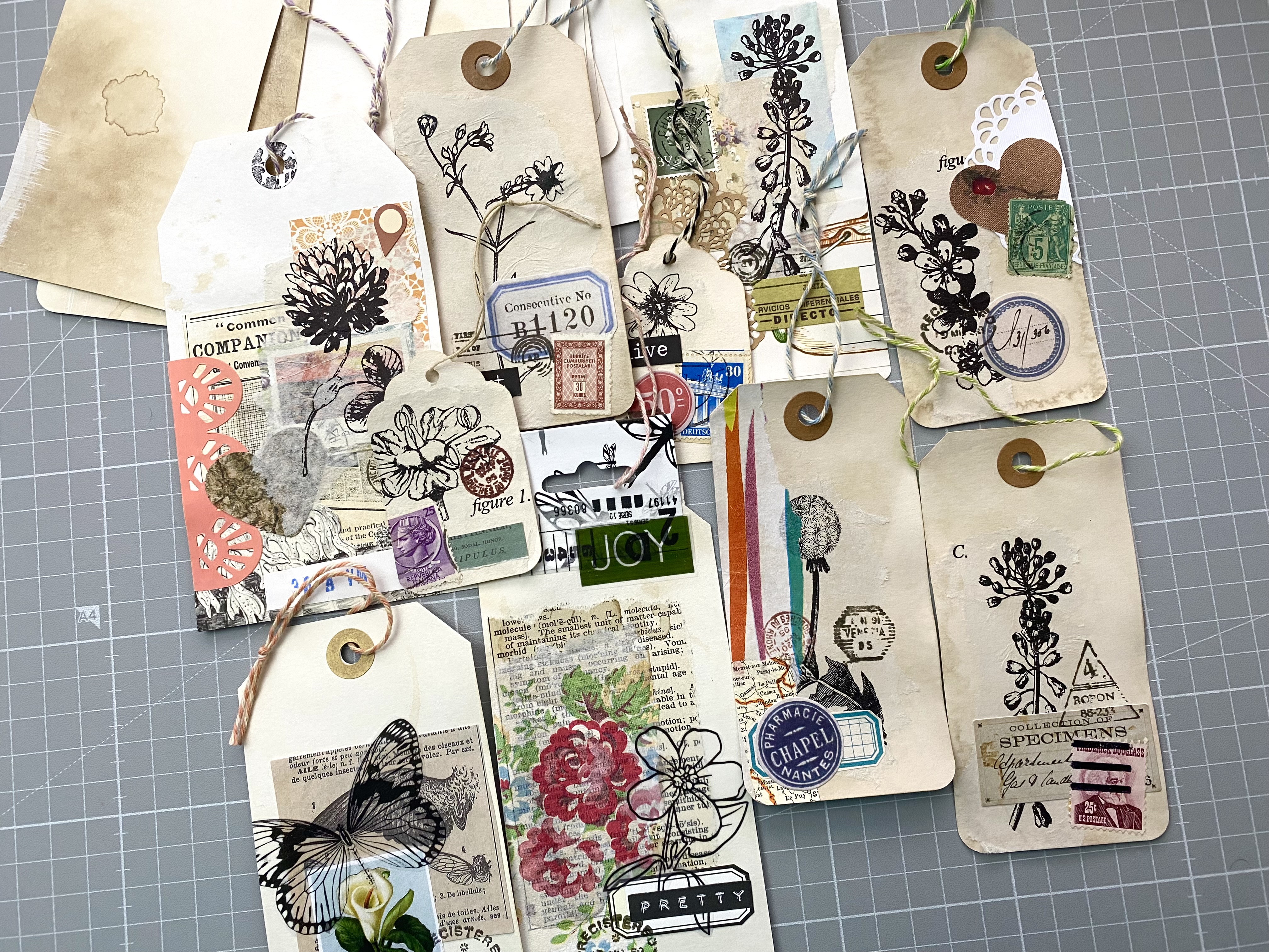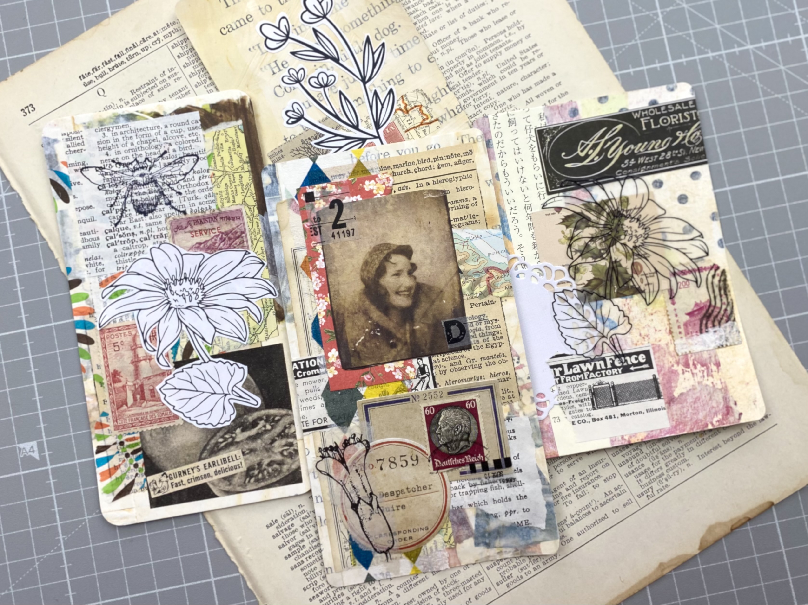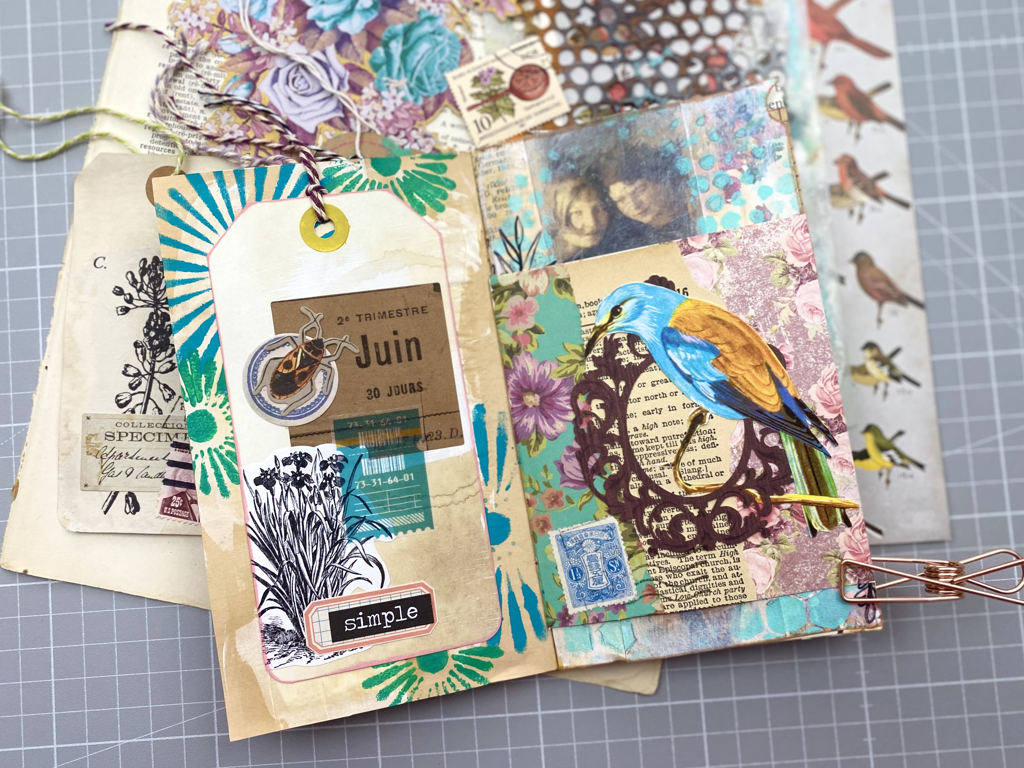 Thais one was fun! The book I used was from 1927, so not really considered an “antique”, whatever, I’m a rebel. Children’s book images, stenciling, fussy cut florals, and a little ephemera cluster…keeping it simple.