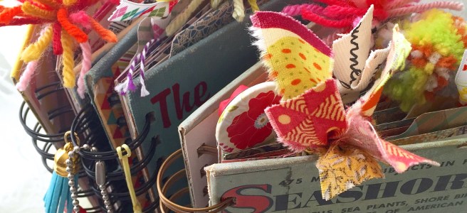 This tag is one of those things that floated around my room until it found a home. It’s made from the remnants of a painted page I cut down for a journal in my shoppe. With just a little cutting and decorating, it’s a great addition, and another excuse not to throw something away!