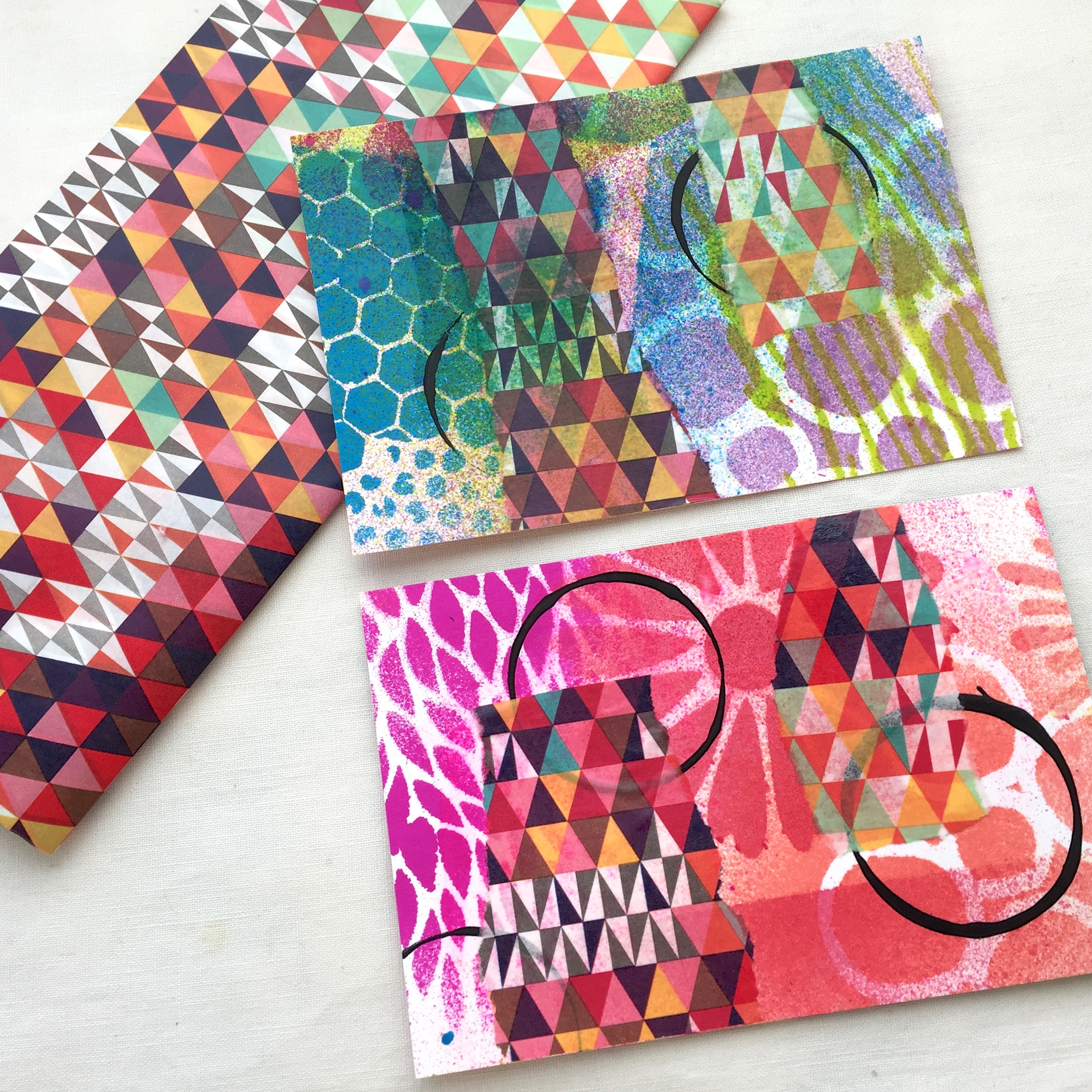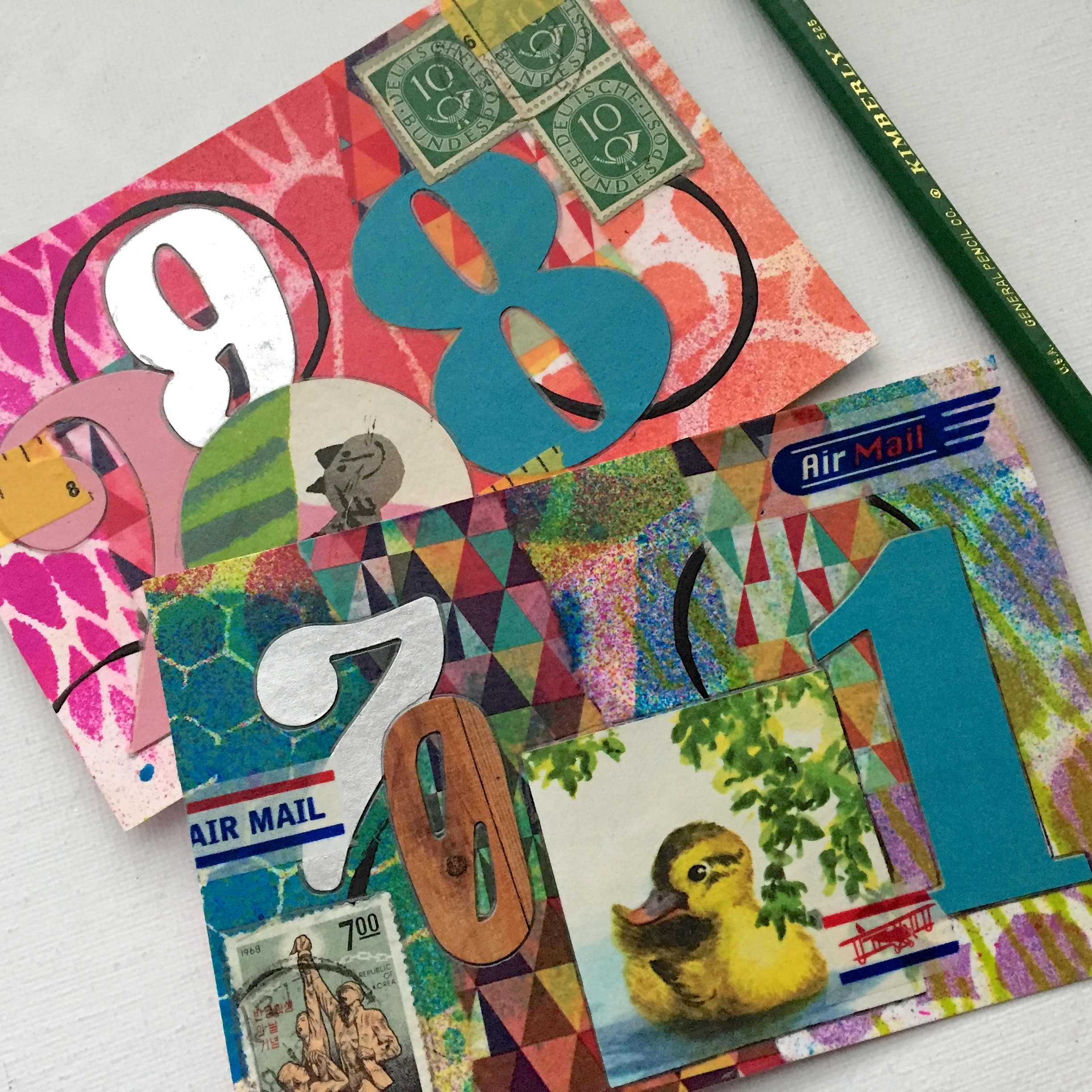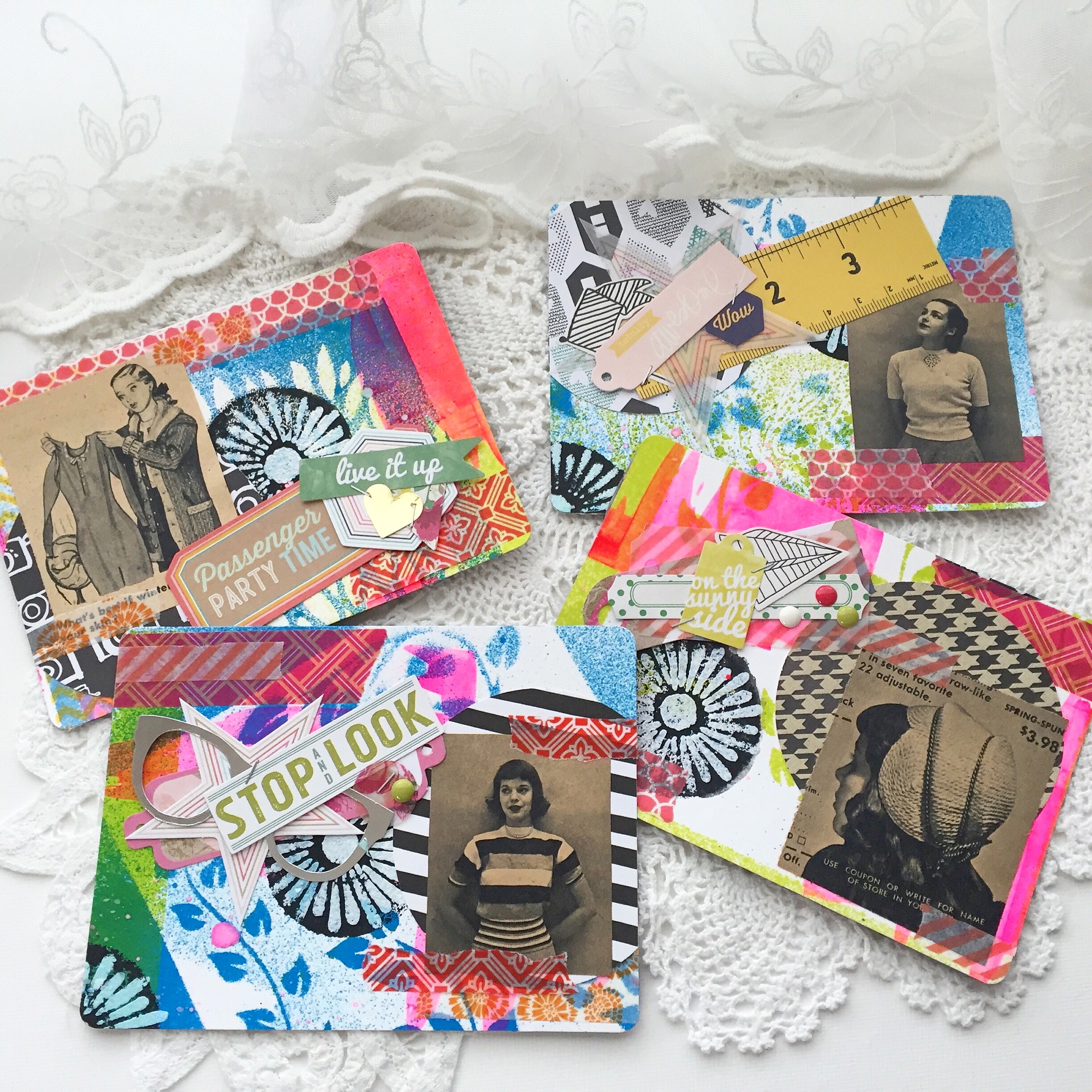 I went over each one with tinted matte medium (I explain that here). After they’re dry, I go around some of the elements with a 9B pencil and eraser. The card at the top left is the before, the lower right the after. I love the shadows and contrast the pencil makes.