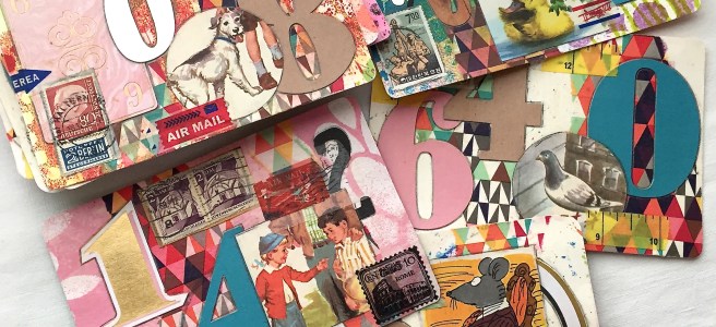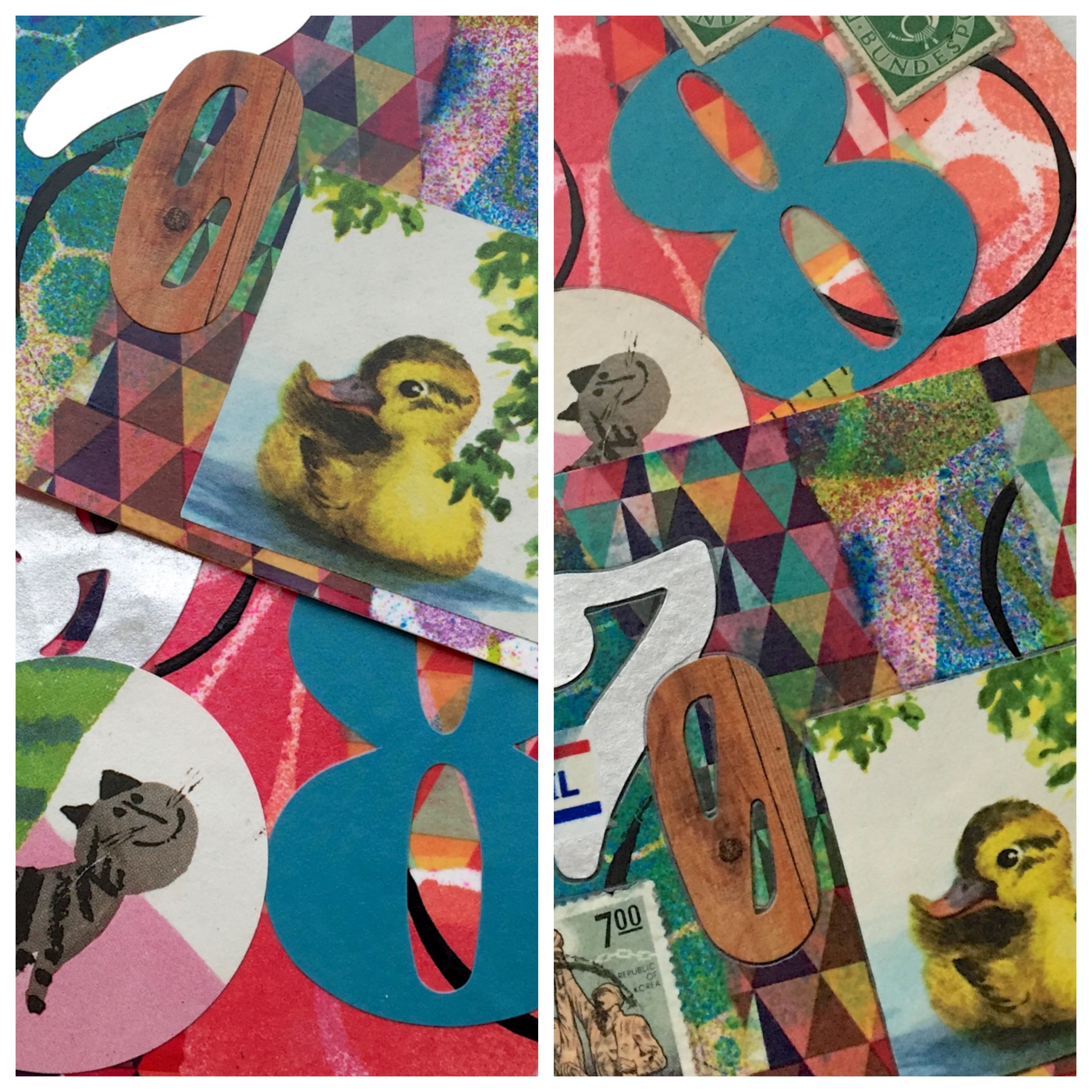 I have kind of a loose layering system, having my stash organized works much better for me. Because the background is such riot of color, I went with neutral images, then built from there. Some of you may recognize some of the goodies you have sent to me over the years, thank you!