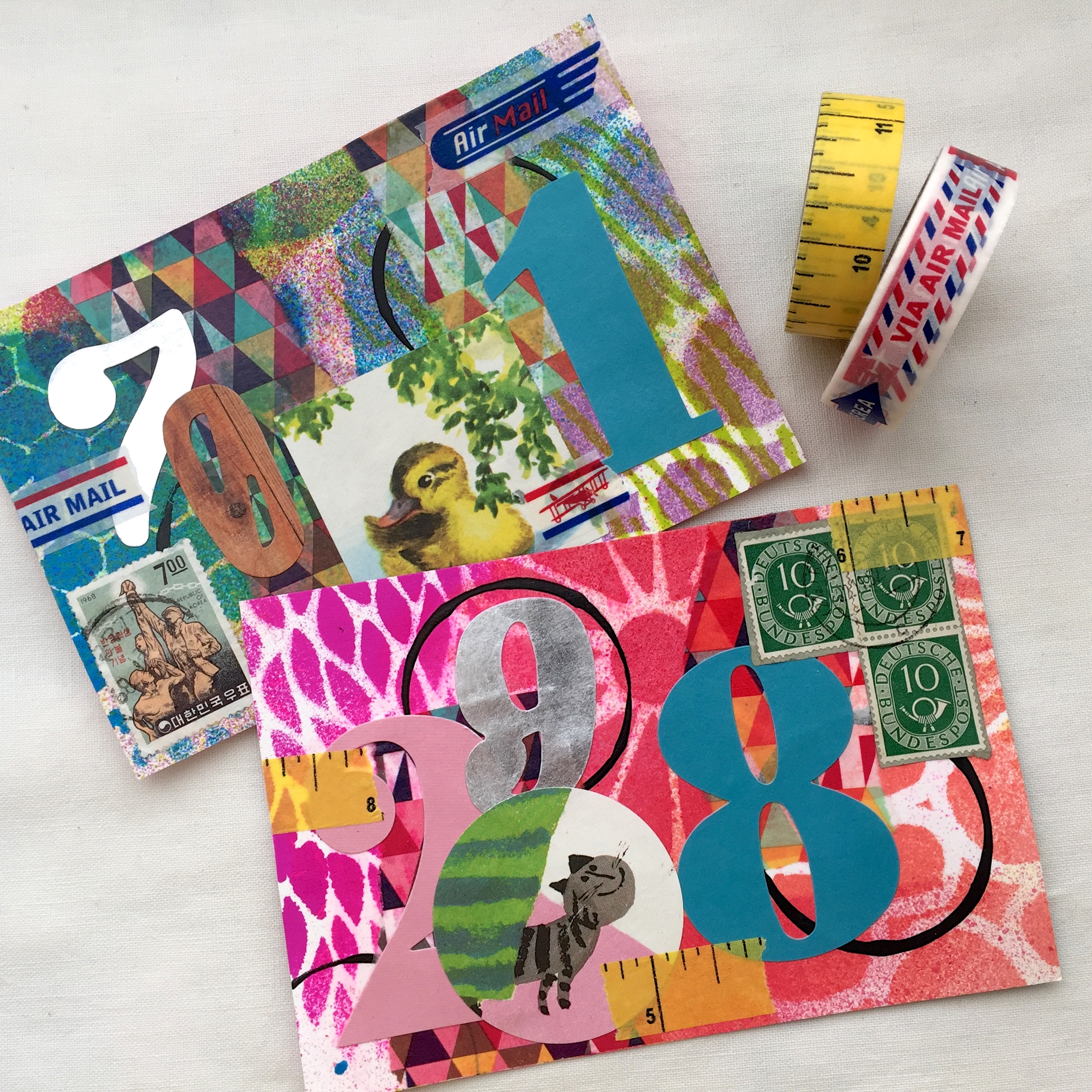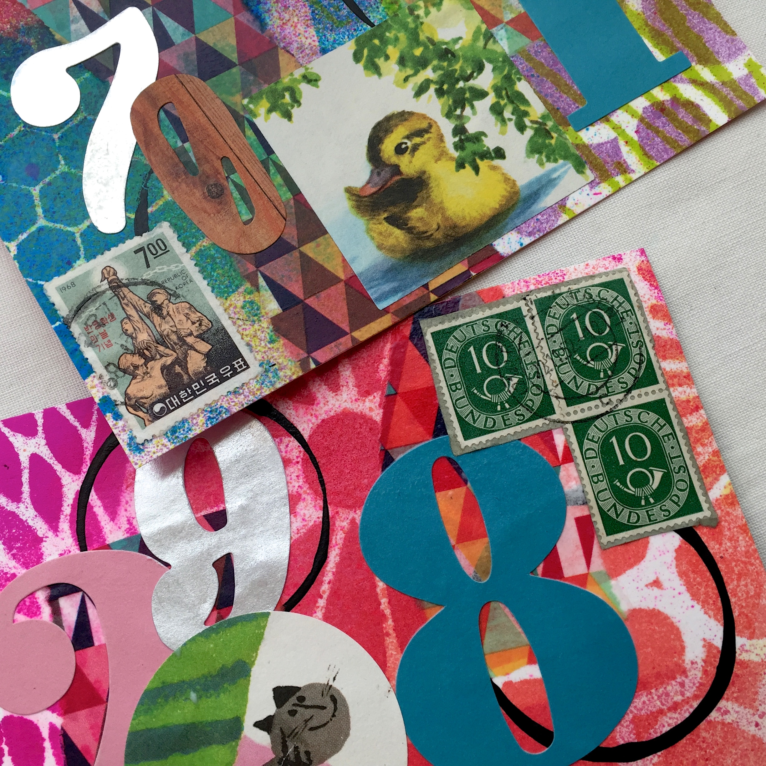 First, stickers, then the image, stars and hearts, the postage stamps last.