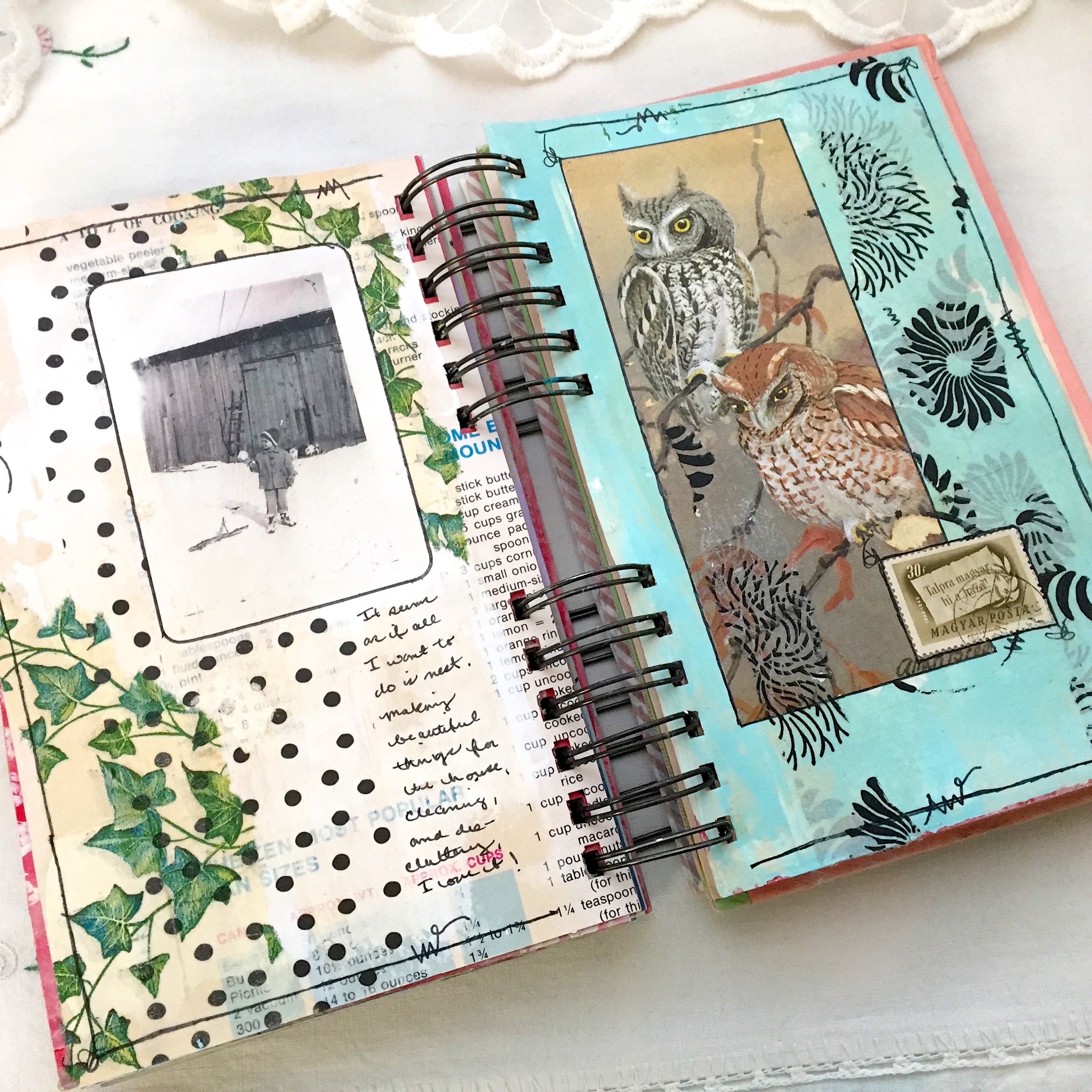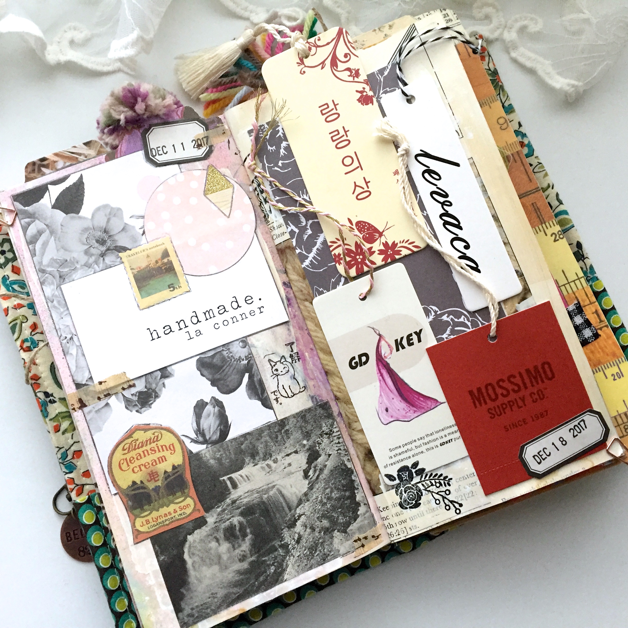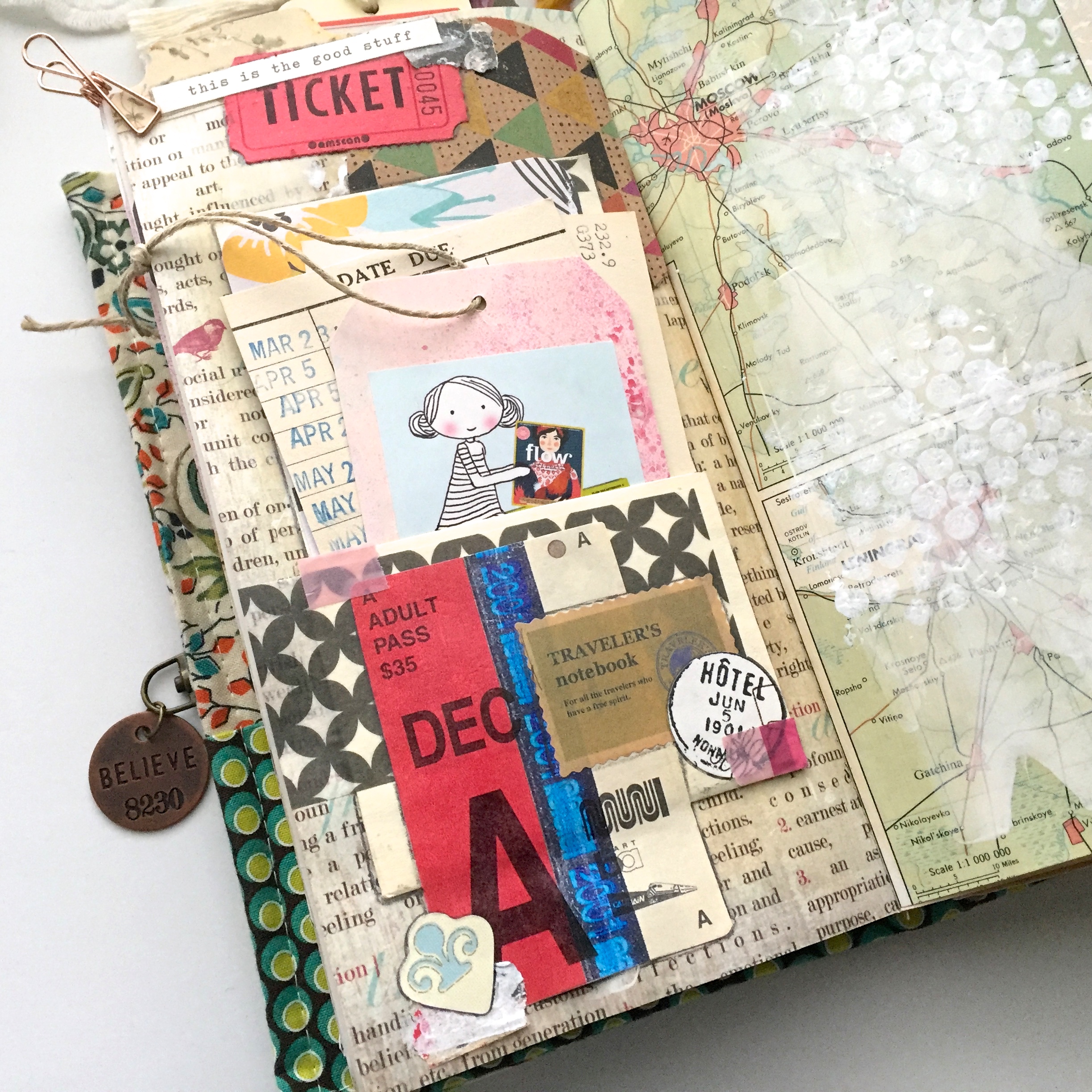 Journaling spots: that piece of paper in the middle is from a larger piece that I used to dry some coffee dyed bits on, they made all kinds of interesting stains on it. Then I cut some of it down to 8.5″x11″ (letter/A4 size) and printed graph paper on it then cut out some tags