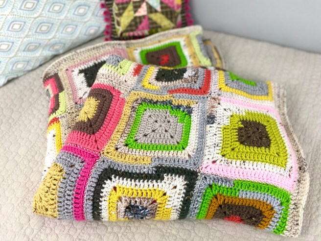 One for me, one for my daughter, and one for my grandson. This one is mine, taking photos of blankets is a pain, but you probably get the picture here, tons of color. I create these by tying random lengths of neutral and colorful yarns together, rolling them into balls, and crocheting them into squares. This involves a ton of end weaving, but the end result is super fun!