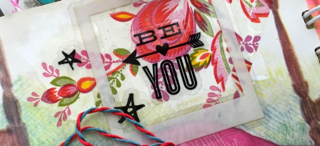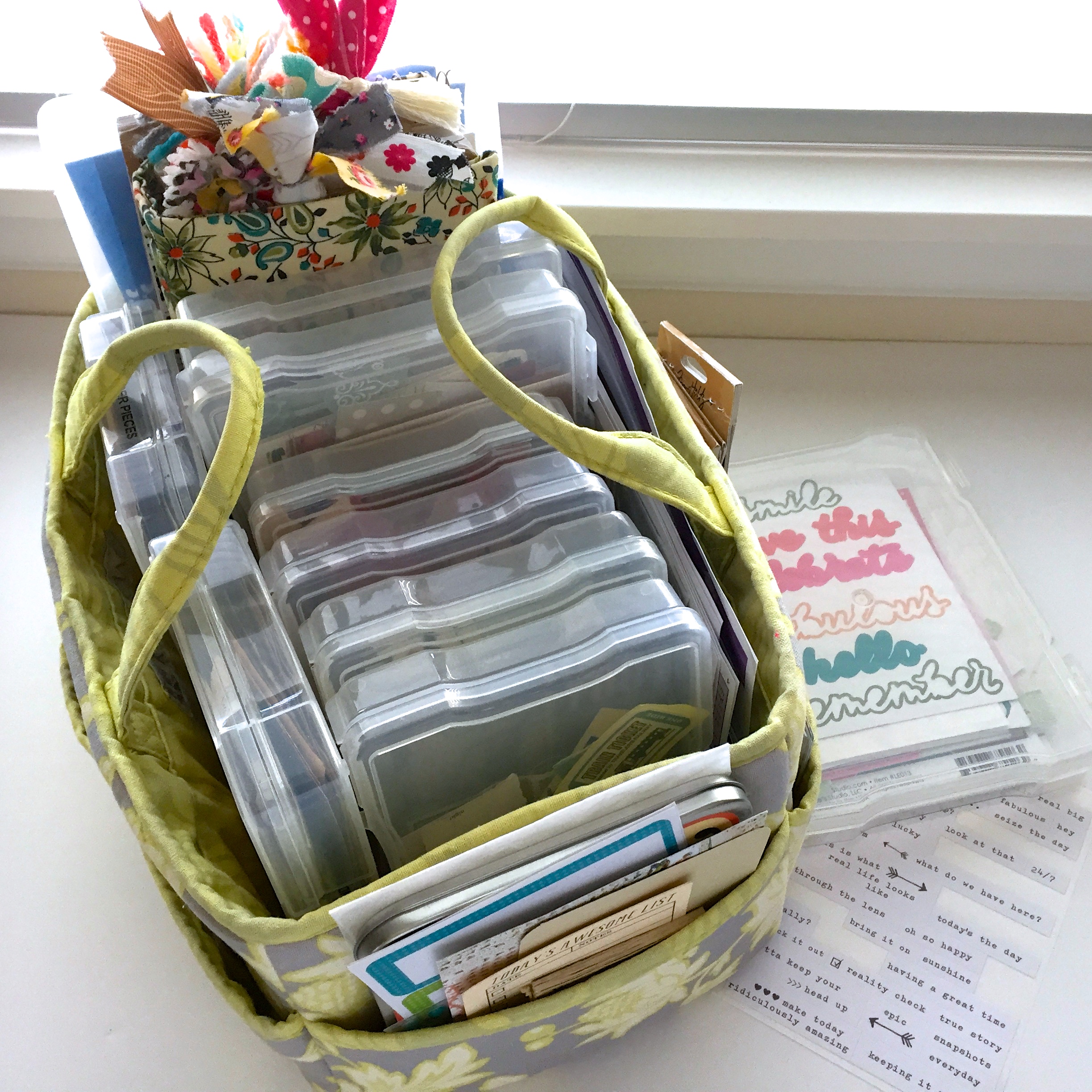 My biggest problem was having all the bits and pieces spread in different parts of the house. I tried a few options, but this tote really worked out the best. This was my “Random” art journaling tote. I found that a lot of the “randomness” in it worked perfectly with this project, so it wasn’t a difficult shift.