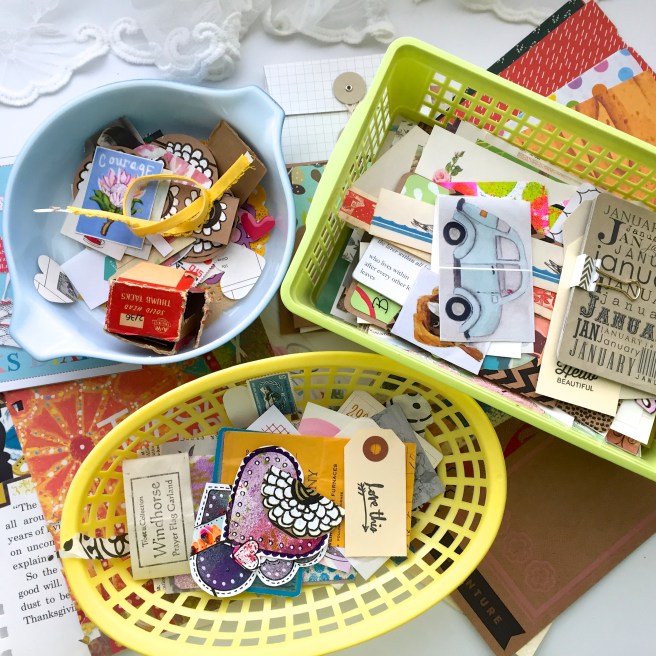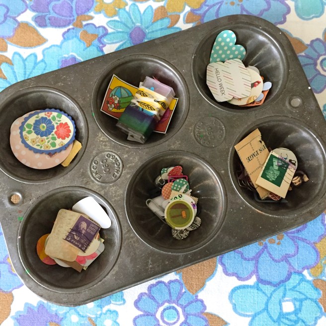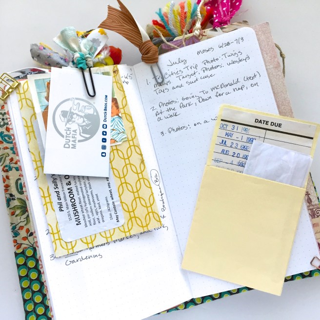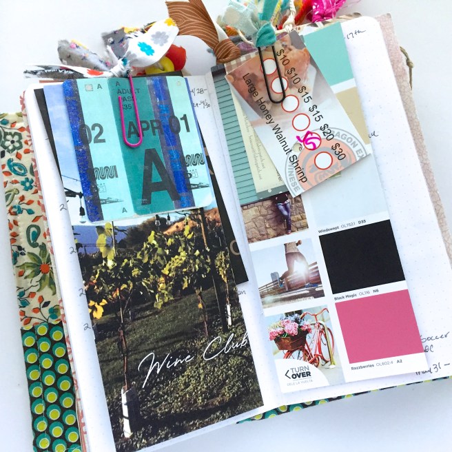 Because I had put this project on the back burner, it was a bit tricky coming up with some of these fun bits and bobs to art journal with, but I found a few things tucked around my art space. As I run across things, I paperclip them into this insert on the corresponding date, then jot down a note or two.