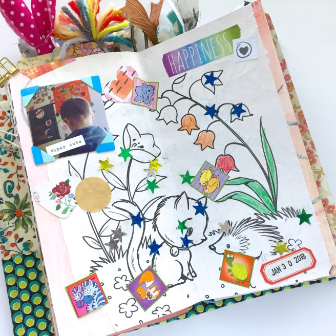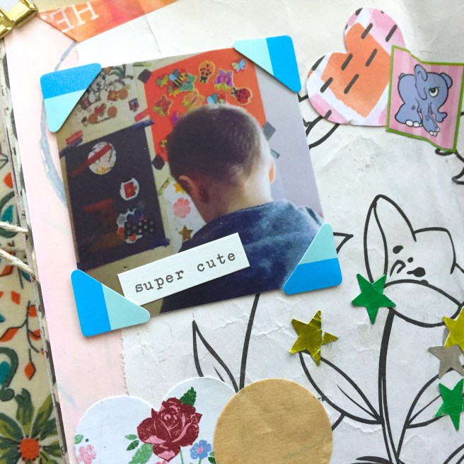 I jumped ahead date wise with this page spread because I wanted to adhere it to the stronger pages of this journal insert. My grandson made this cute little page, put it up on the wall, then proceeded to tear it off the wall when he was supposed to be napping. I had a hard time rescuing it, but it’s safe now! (Fyi: I think my daughter colored in that flower, he’s more of a sticker boy!)