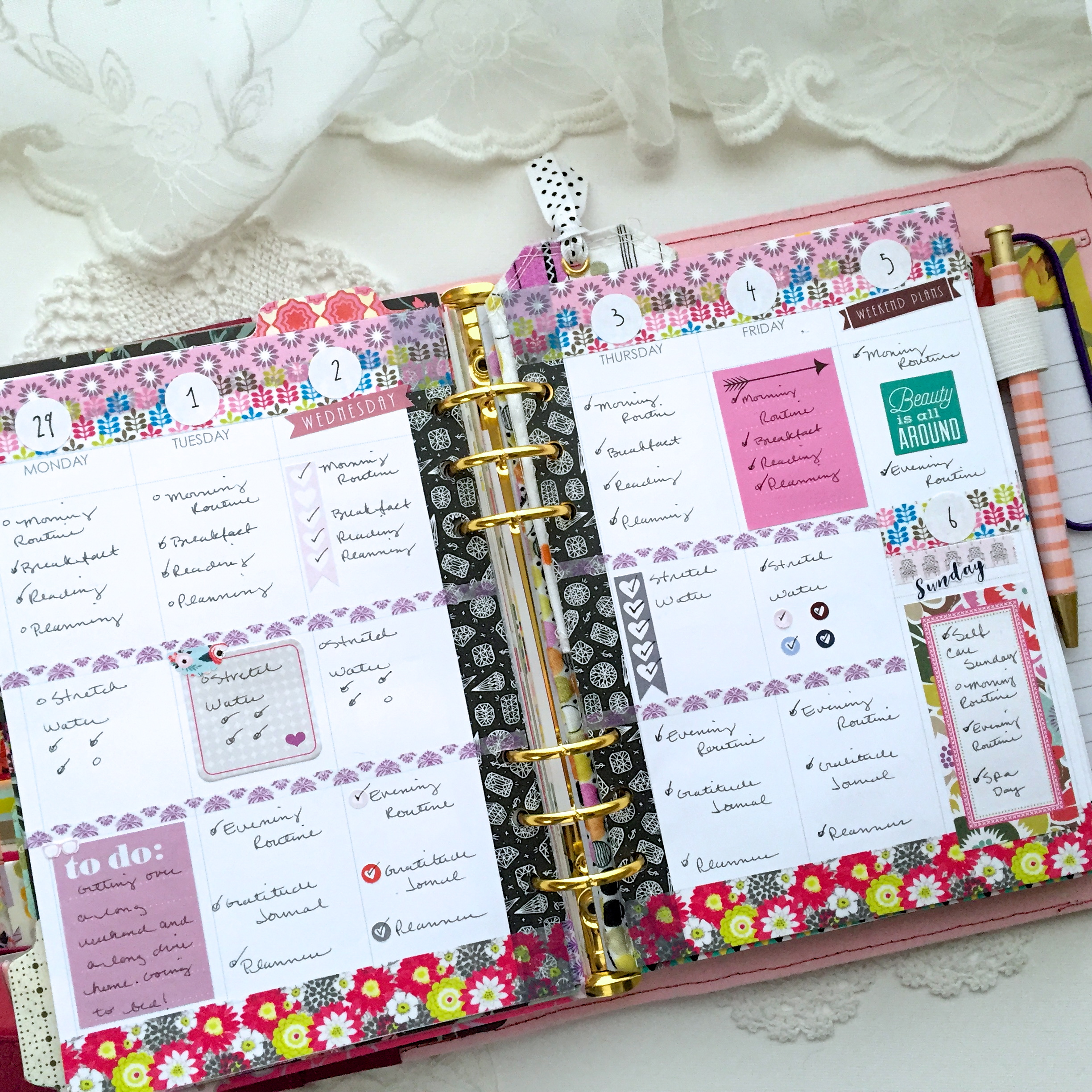My awesome little planner pocket care of TheKiwiRose shop, I adore it! I’m stepping up the decorating in this planner because that seems the best way to get familiar with it. It’s still a work in progress, like I said, I haven’t found very much info on self care planners.