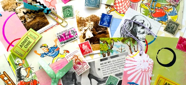 Punching tags out of the painted page remnants. Waste not, want not! A perfect way to use up small scraps of baker’s twine too!