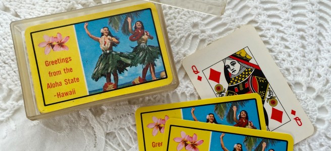 Then there are these, some super tiny playing cards. When I bought these they were taped up and just the card facings were showing. So, imagine my surprise and delight when I opened them up and found these retro hula girls on the covers! Yowzza!