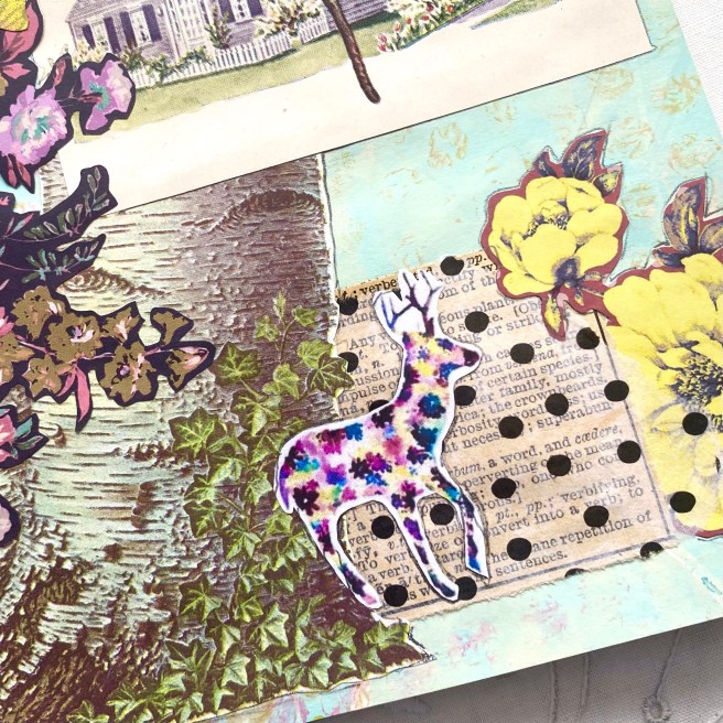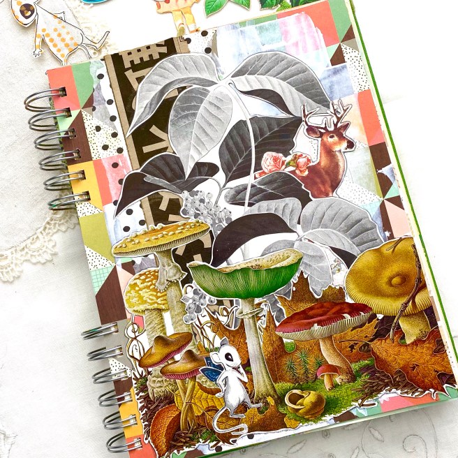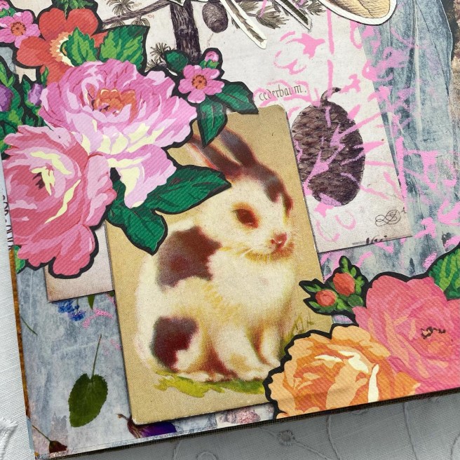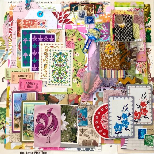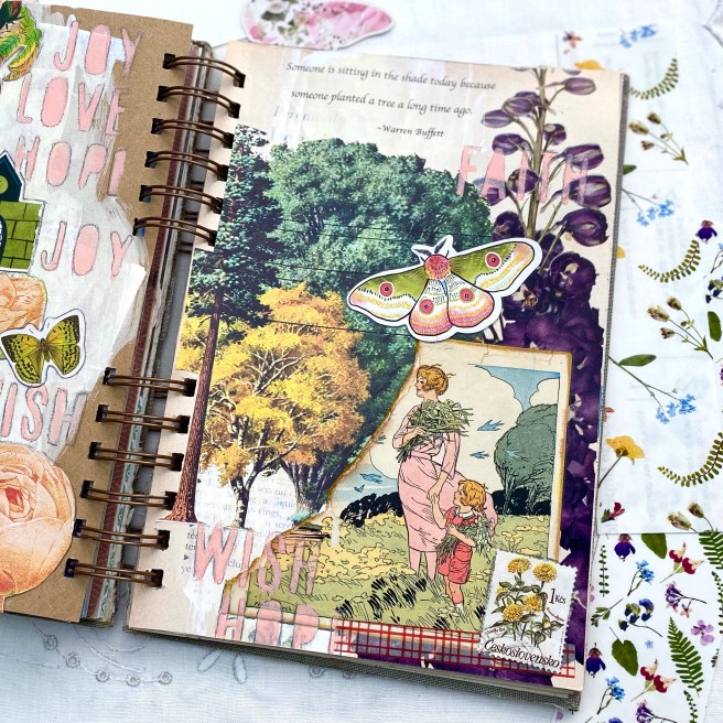 I’m trying something new on my YouTube channel, talking about my shoppe and using the “ephemera pack leftovers” in my videos. This is the page spread I created in my video. It was fun, but not quite what I was picturing in my mind. Isn’t that always the way, sometimes it’s hard to hit that creative sweet spot, but other times it happens almost magically…go figure. You can watch the video of this page spread here: Eclectic Art Journals