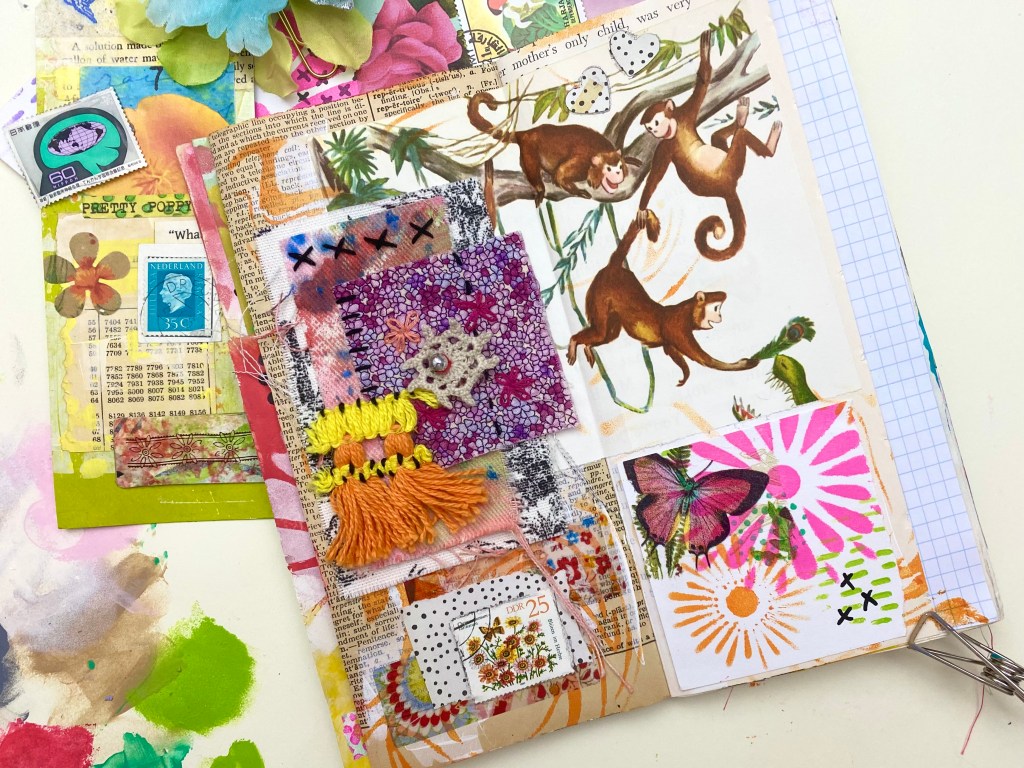 There’s a lot of handmade items in this one, stitched collage pieces, painted backgrounds, tags, paperclips, library pockets, pieces of a masterboard, the list goes on. I took a bunch of my most colorful bits and pieces and just started making. It took quite a while to get it all made and organized, and believe it or not, it sat waiting for about eight months to be put together and photographed for my shoppe. Such a slacker!