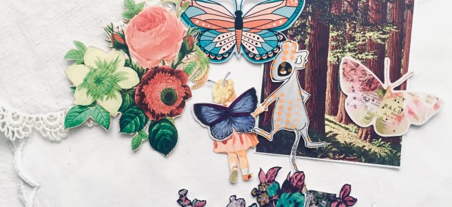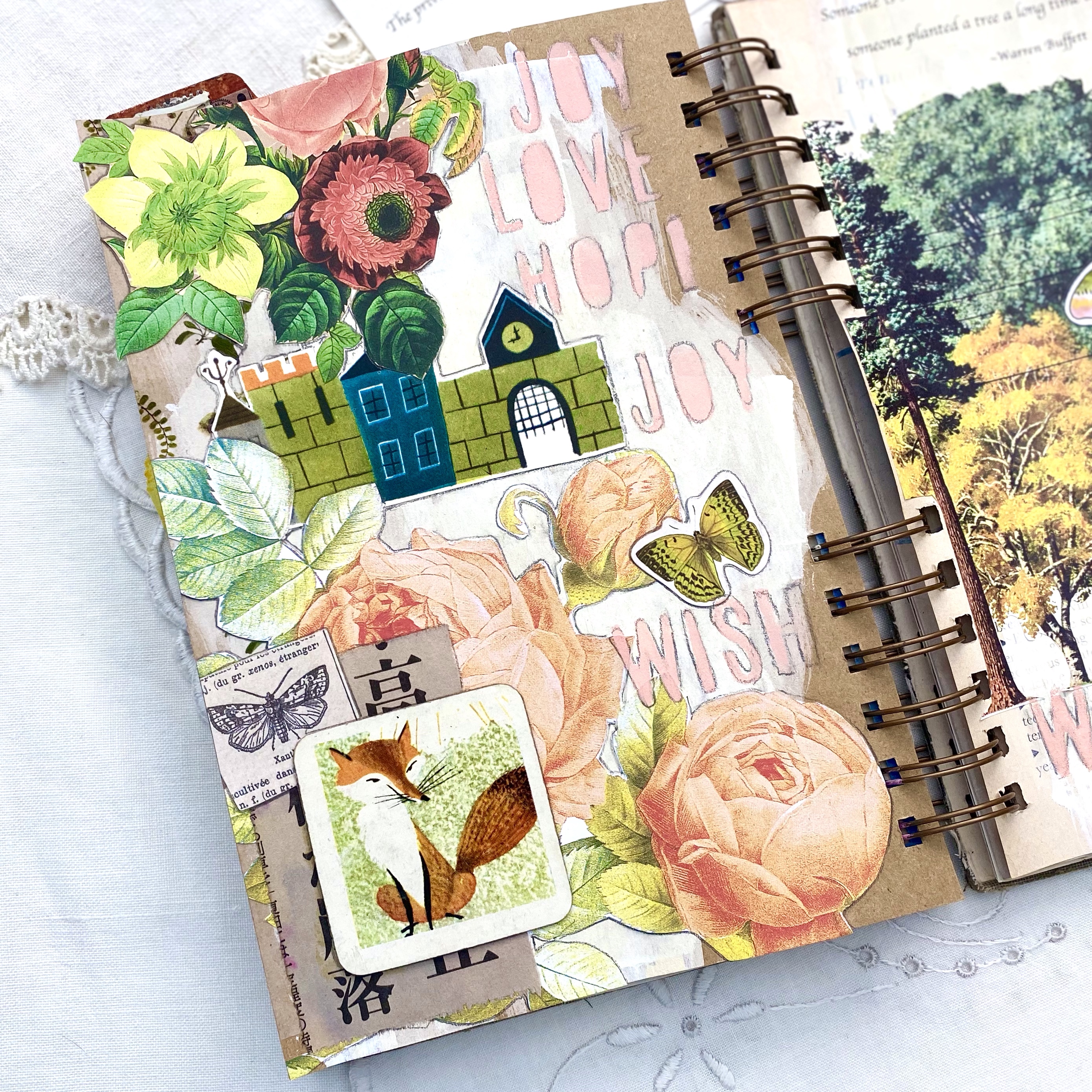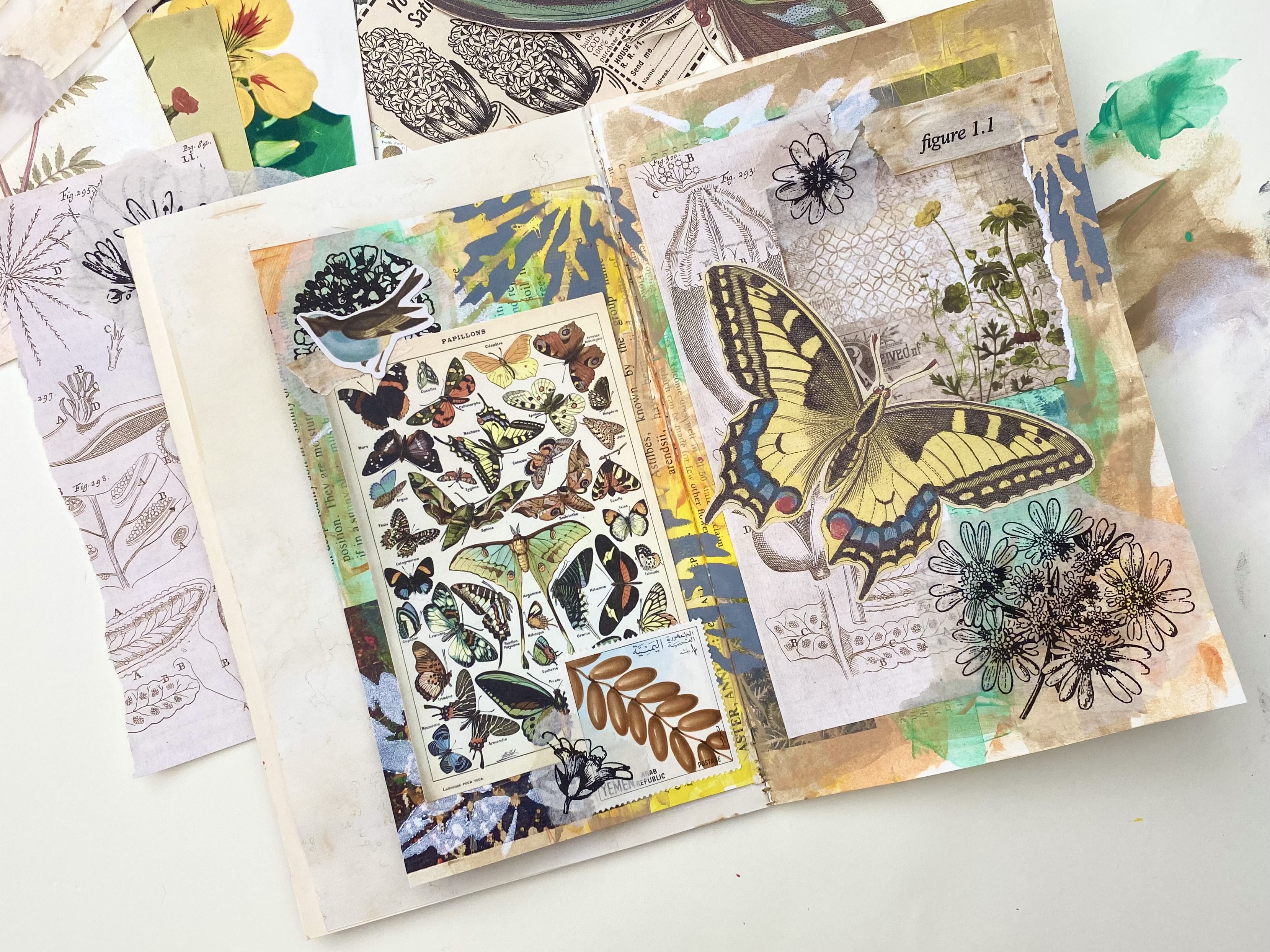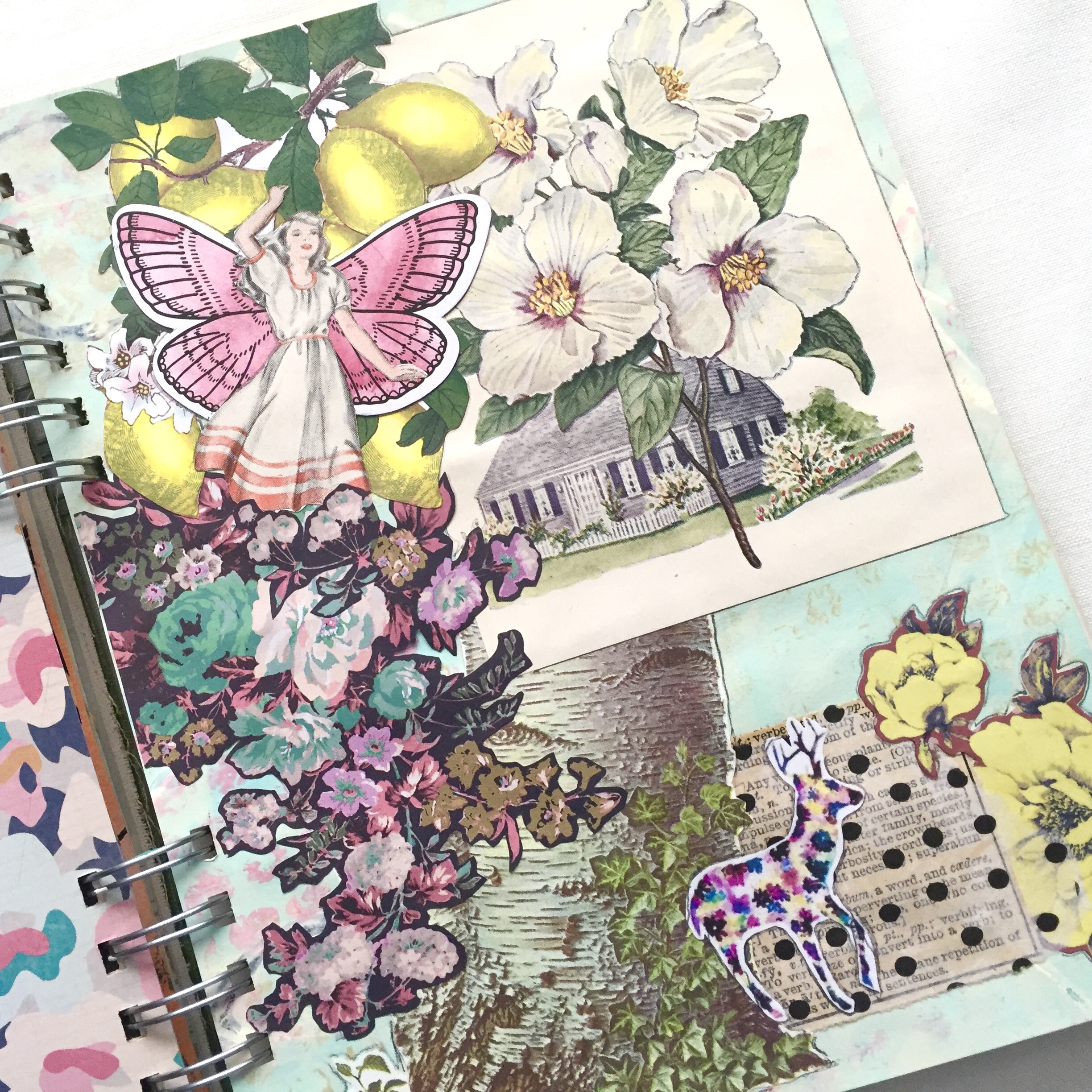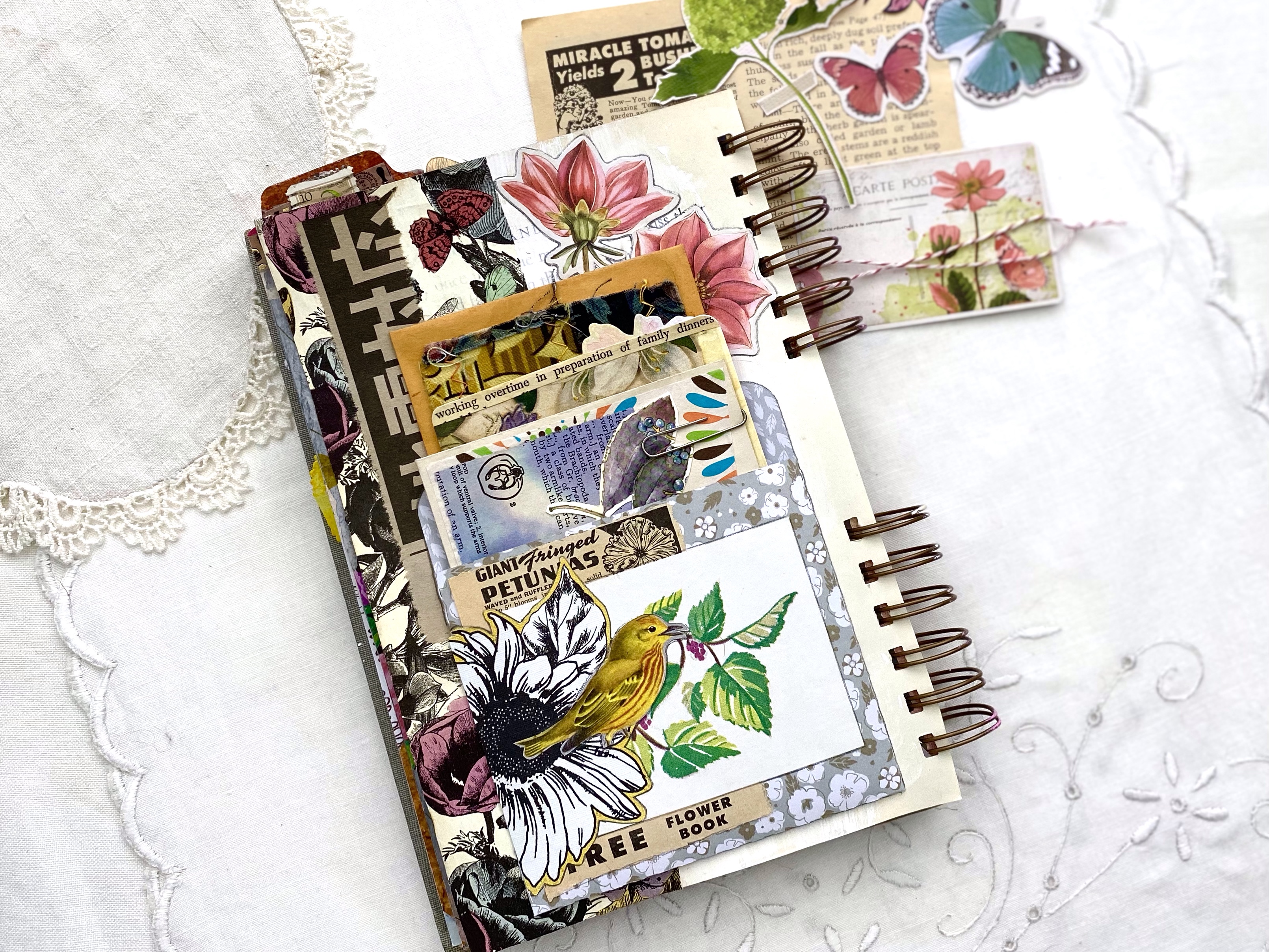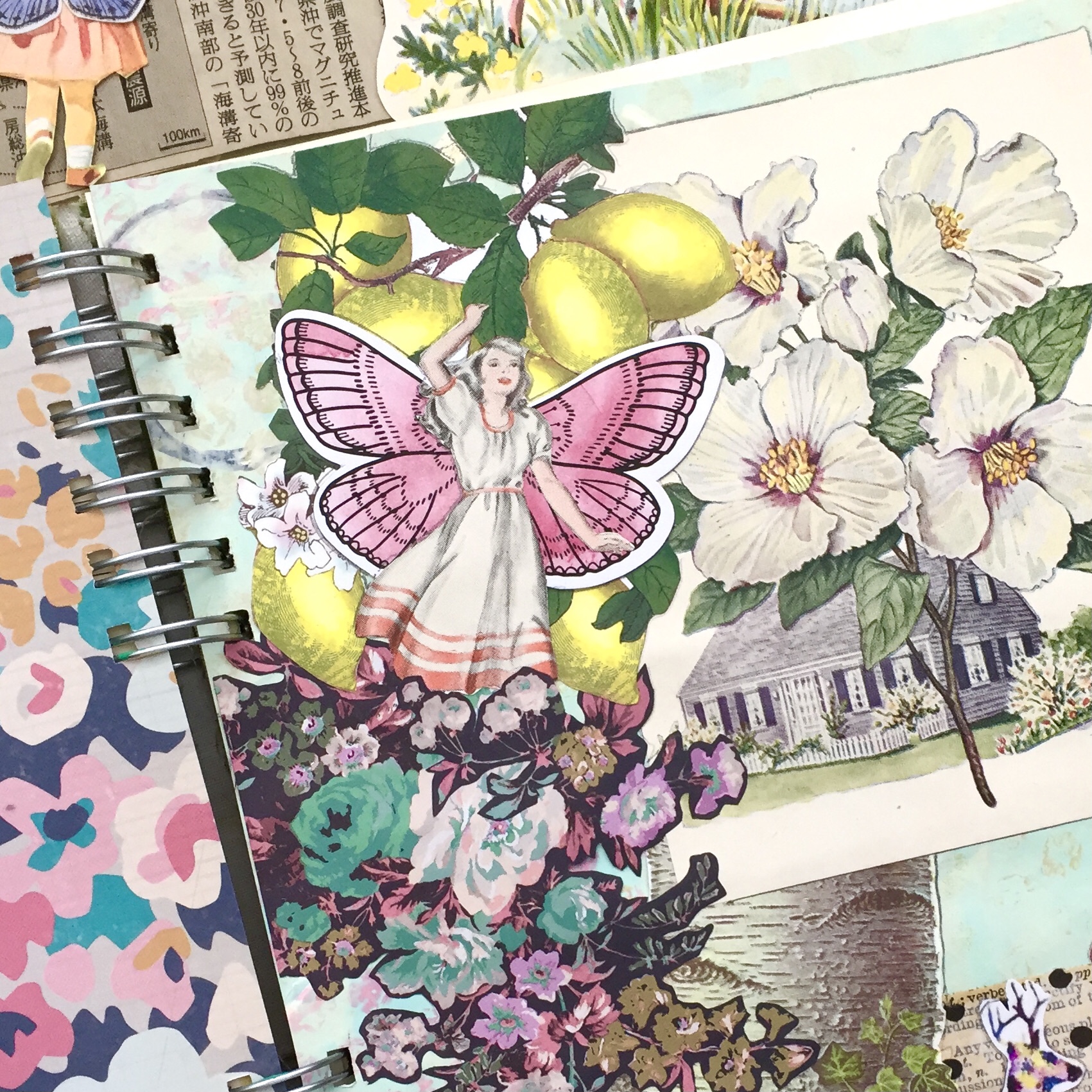 I’m trying something new on my YouTube channel, talking about my shoppe and using the “ephemera pack leftovers” in my videos. This is the page spread I created in my video. It was fun, but not quite what I was picturing in my mind. Isn’t that always the way, sometimes it’s hard to hit that creative sweet spot, but other times it happens almost magically…go figure. You can watch the video of this page spread here: Eclectic Art Journals