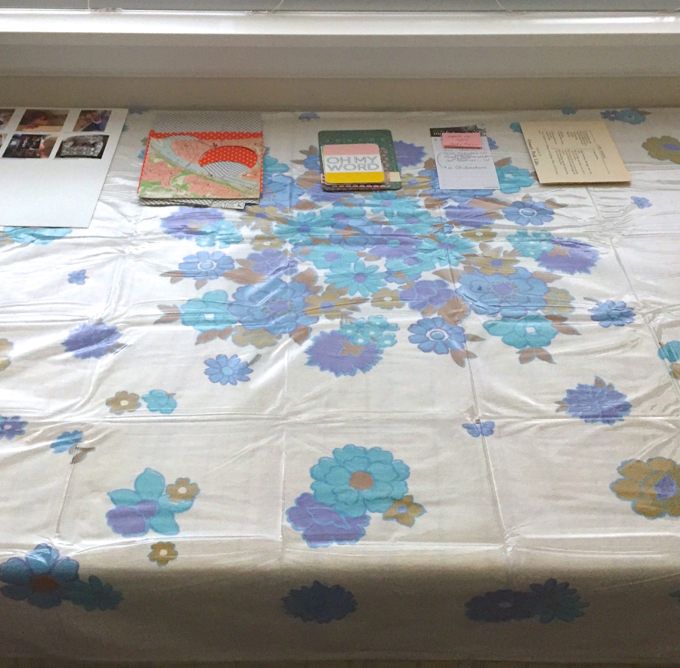 This table sits right under a window, so no decorating here. This will be my only work surface in the room, which is why I didn’t mind filling the larger table with supplies. I’m hoping this will work. Please excuse the plastic table cloths, when the paints come out “It’s every man for himself!”…or woman.