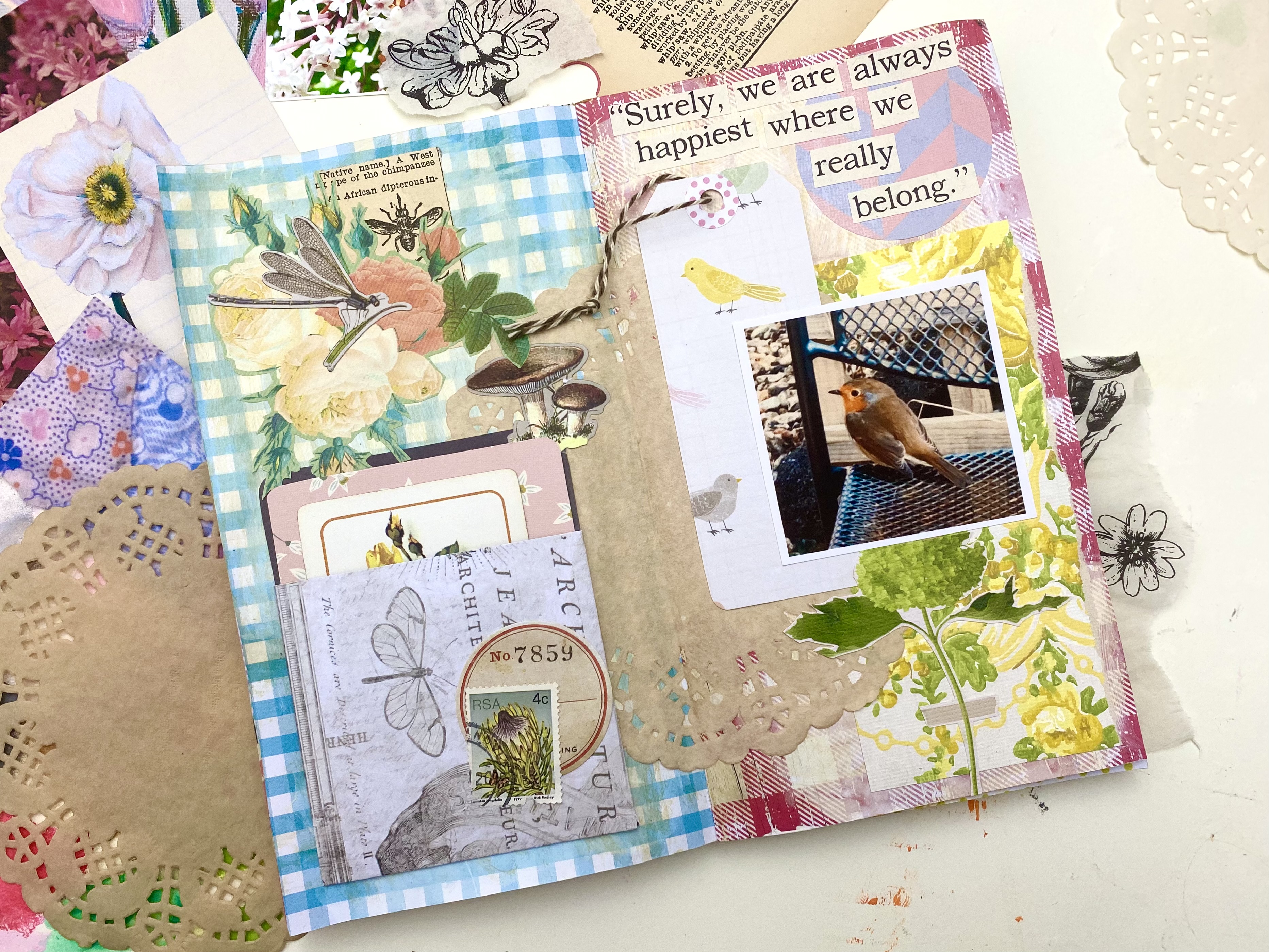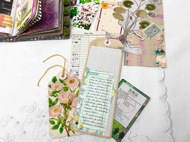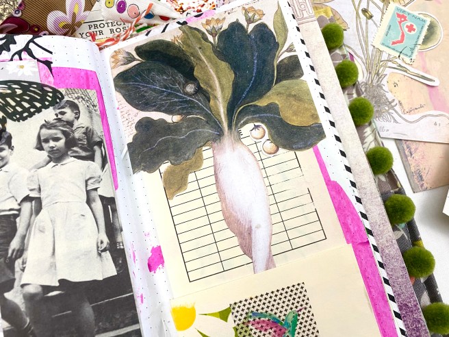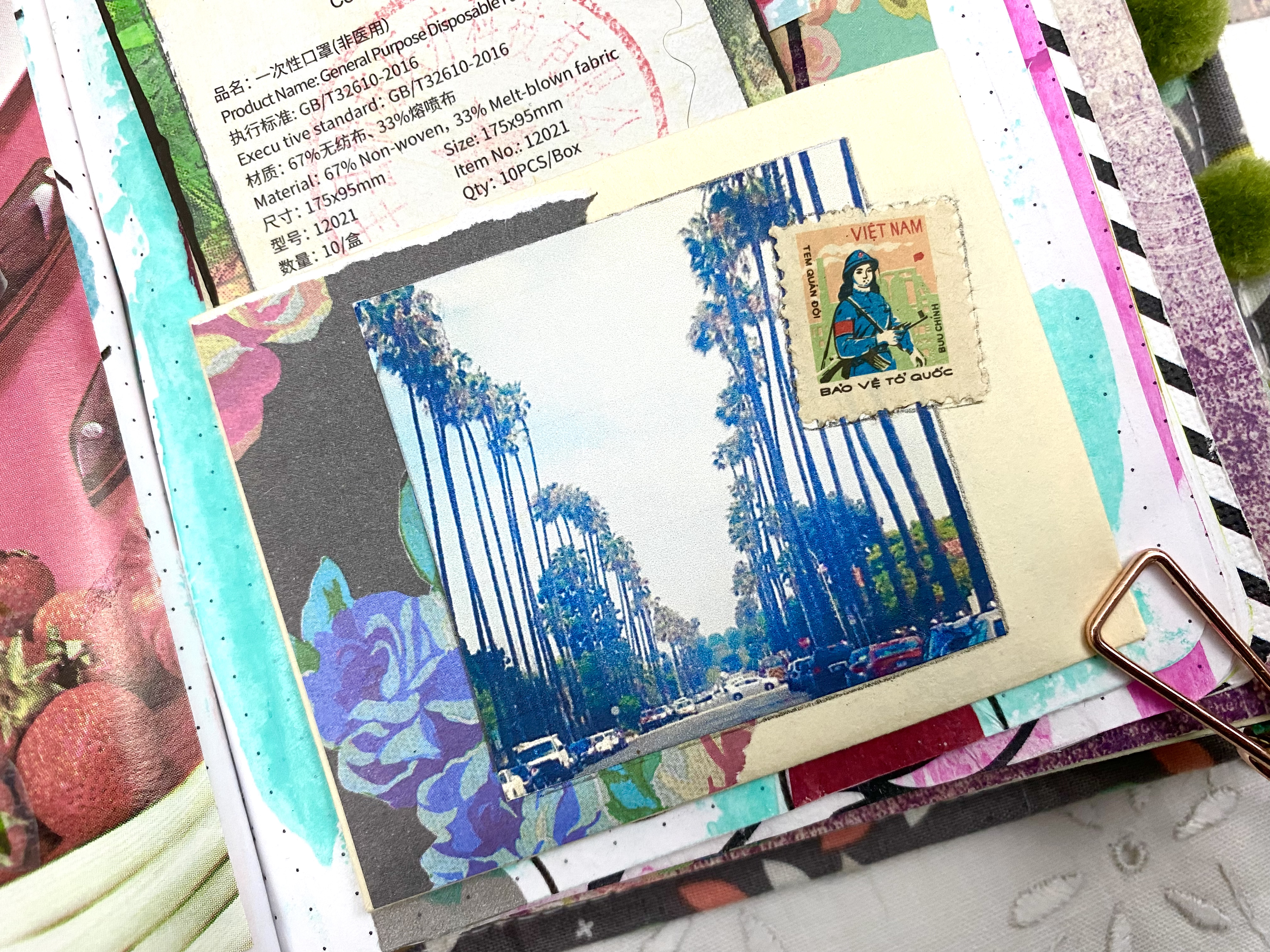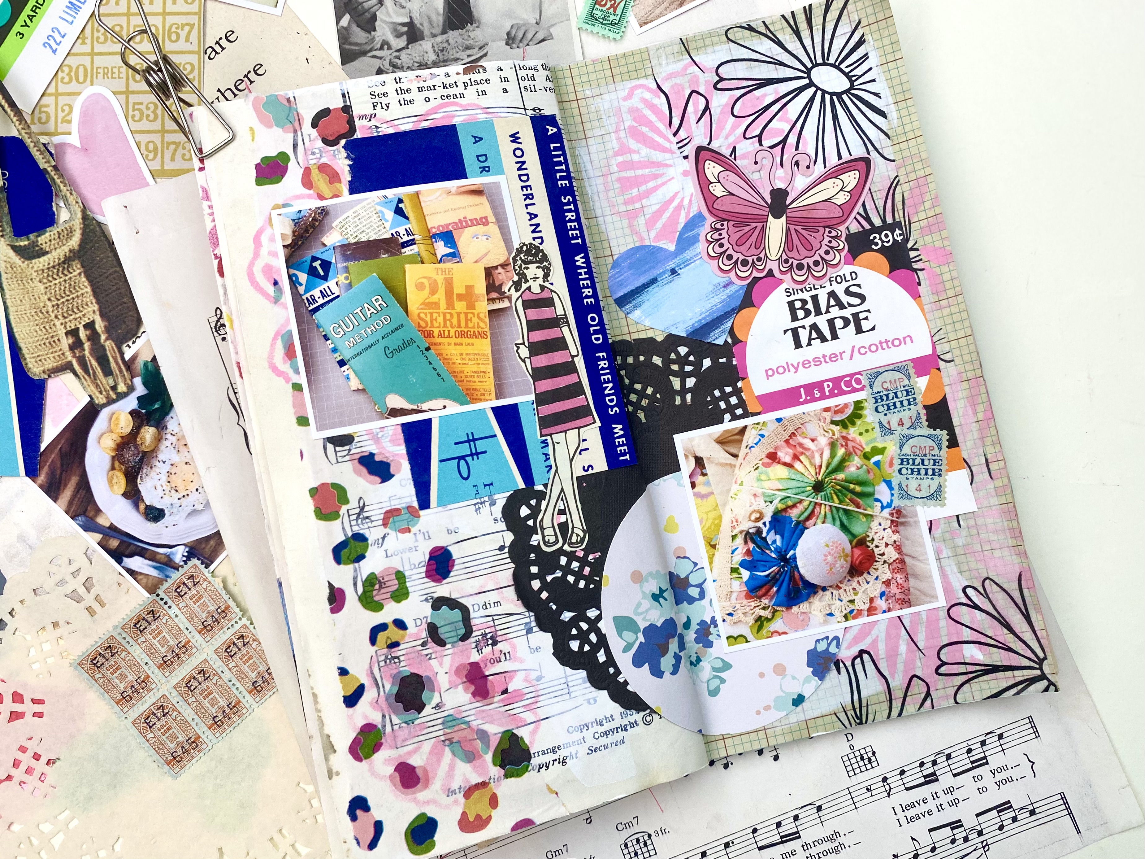 A card from a friend I received in April. I used some of the decor from the envelope to decorate its new little home. And just a cluster with some fussy cut flowers on the right. As you can see, I’m having a lot of fun with color by not sticking strictly to any order. Just get things in the journal!