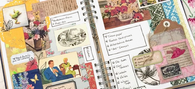 Now, you’re probably going to think it’s a bit silly after all these years to need a reminder of the elements that go into one of my page spreads, but it’s not. When I decide to create a page spread I’ll usually go through some of my old favorite art journals for ideas, especially if things aren’t clicking.