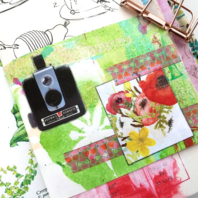 A little mini page I made from a piece of painted background I use in my shoppe journals. I want the little gifts I receive in happy mail to be somewhere I can enjoy them once in a while, like that camera. That sticker is from a shop that’s no longer in business, which makes me sad, so I’m using them a lot in here to.