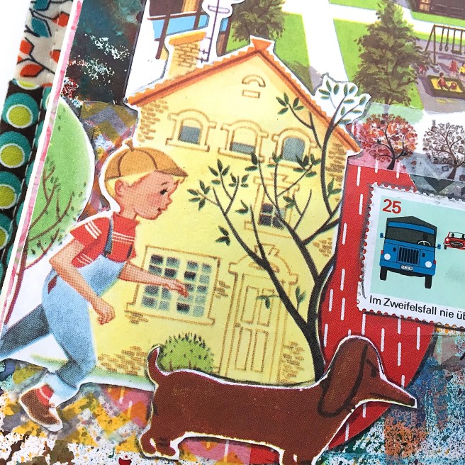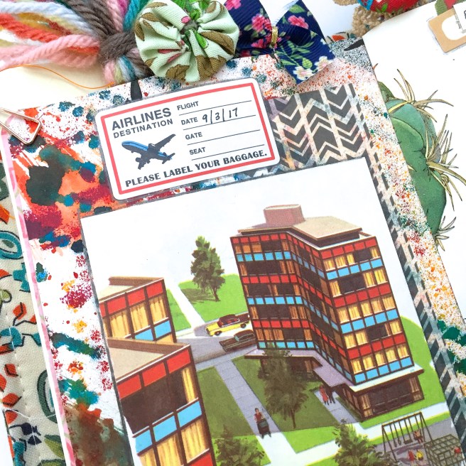 I can’t resist images like this of tall mid century buildings, especially with all that color, love! That background page is from what the “Art to the 5th” girls call “underpaper”, so I will too. It’s the paper I use to protect my work surface, and as you know, I don’t throw much away.