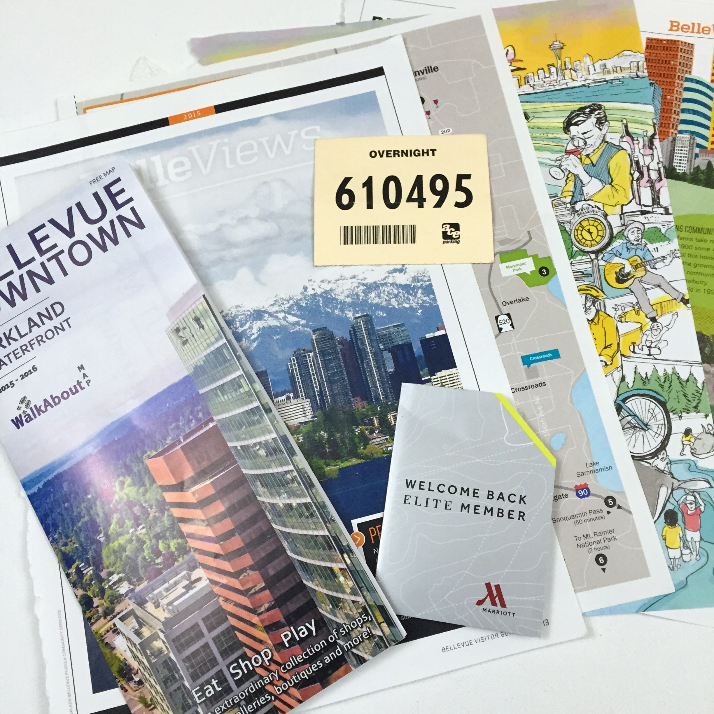 Brochures and maps of the town, our valet parking ticket and a mini folder from our room keys.