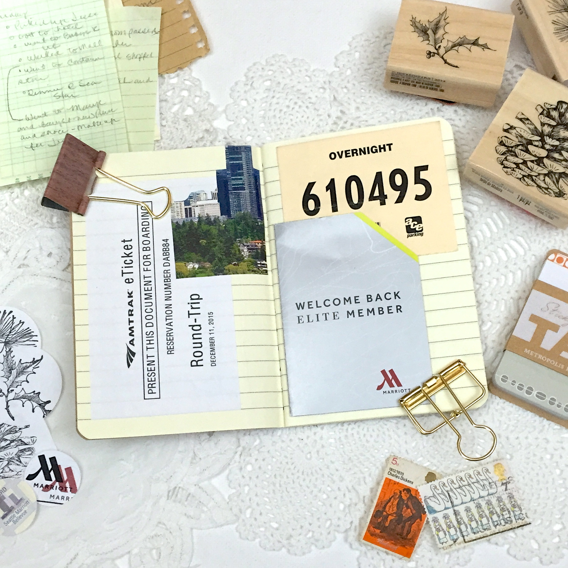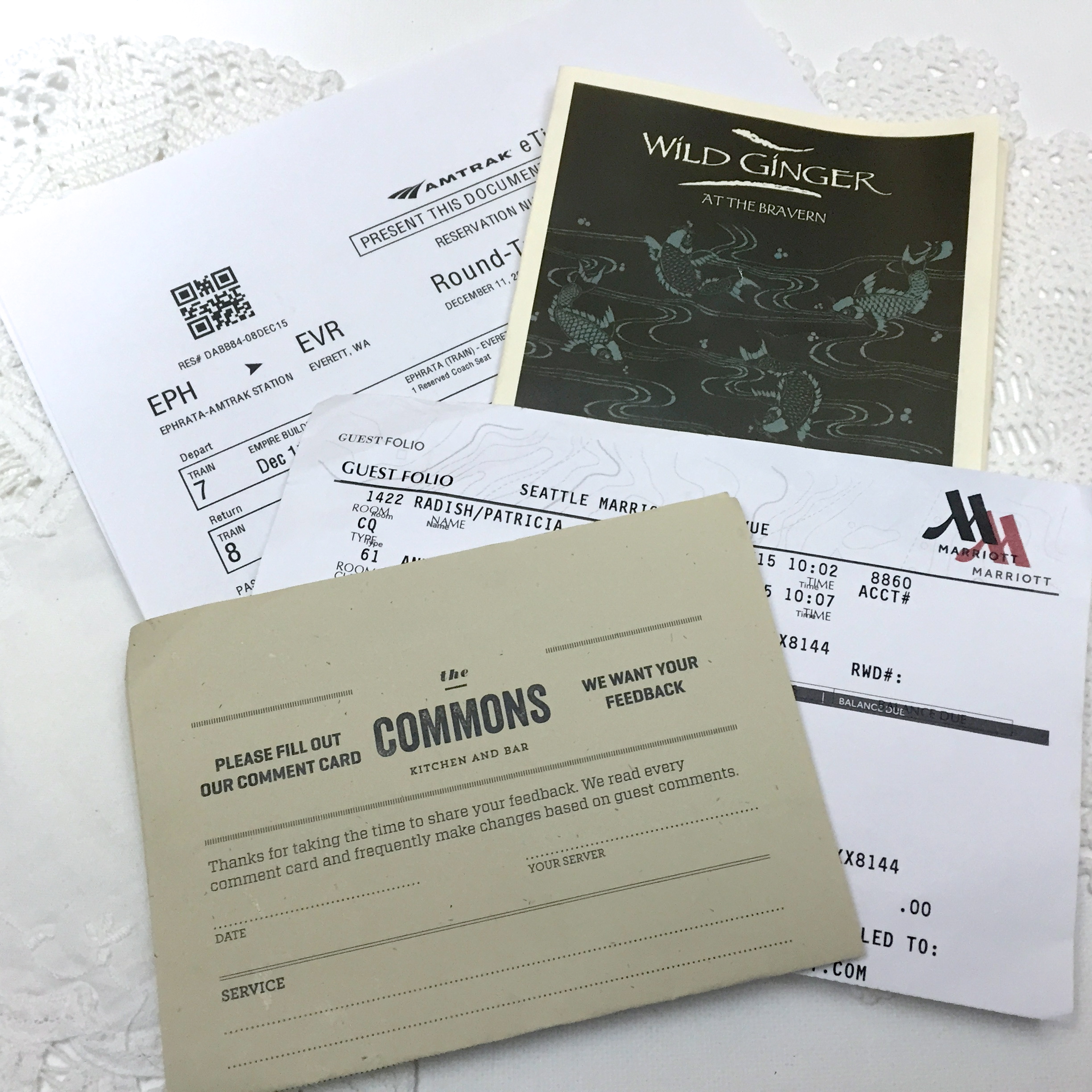 Various ephemera to work with, menu, hotel receipt, comment card, and my daughters train ticket .