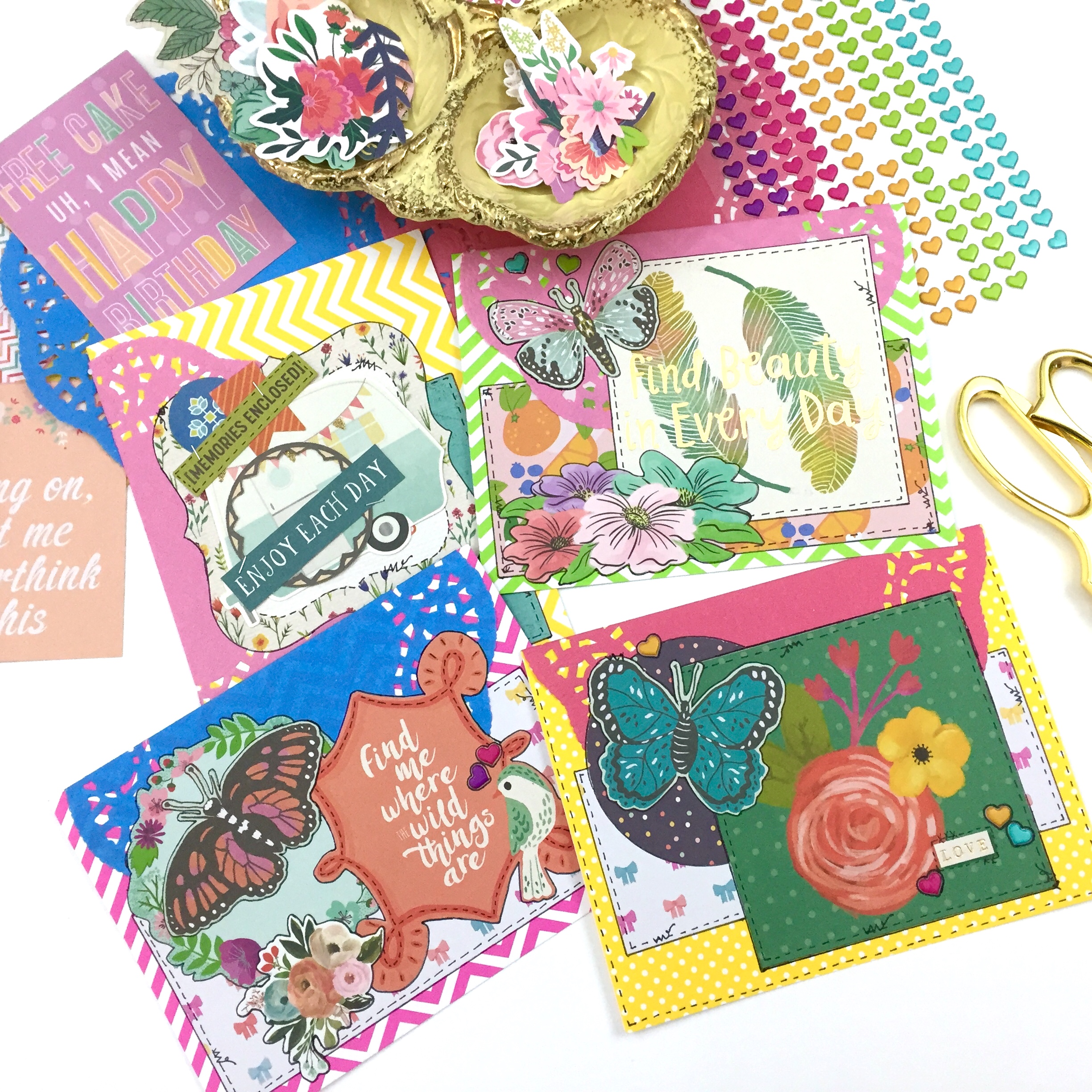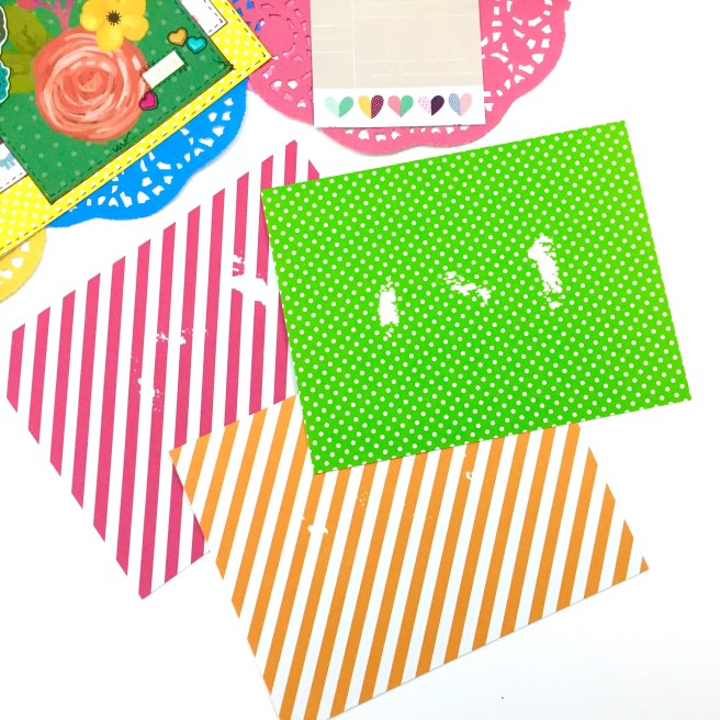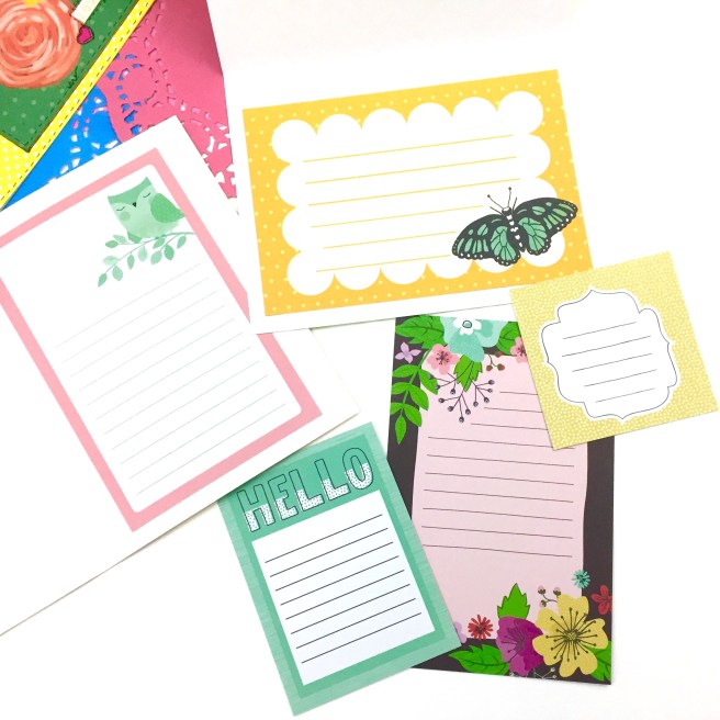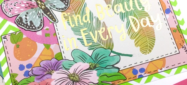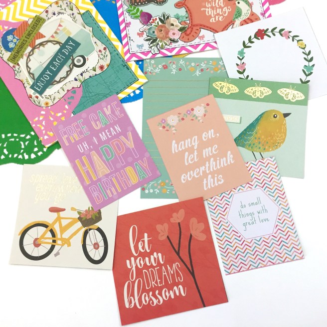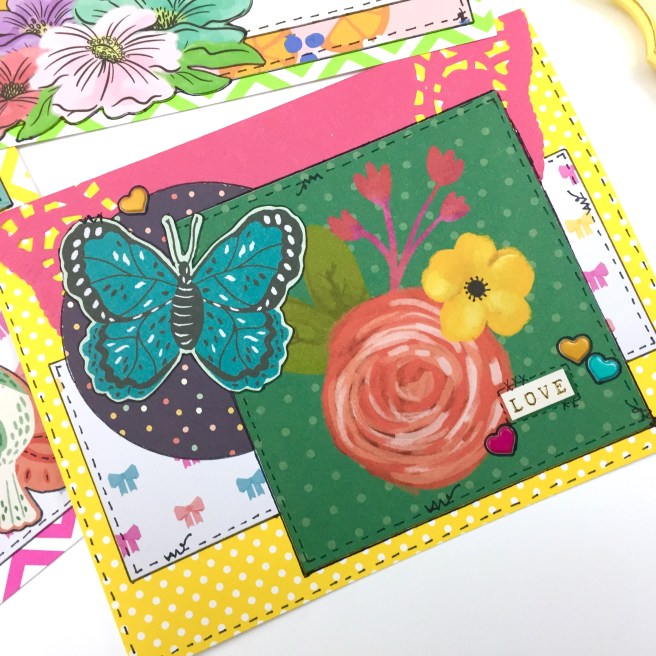 I knew I didn’t want to hassle with trying to adhere paper to that bag, so I printed a design from a scrapbook paper download I had purchased from Etsy onto some sticker paper. Then I found some paper with some metallic designs, a label from Joann’s clearance bins, a Tim Holtz butterfly, and a little wordstrip.