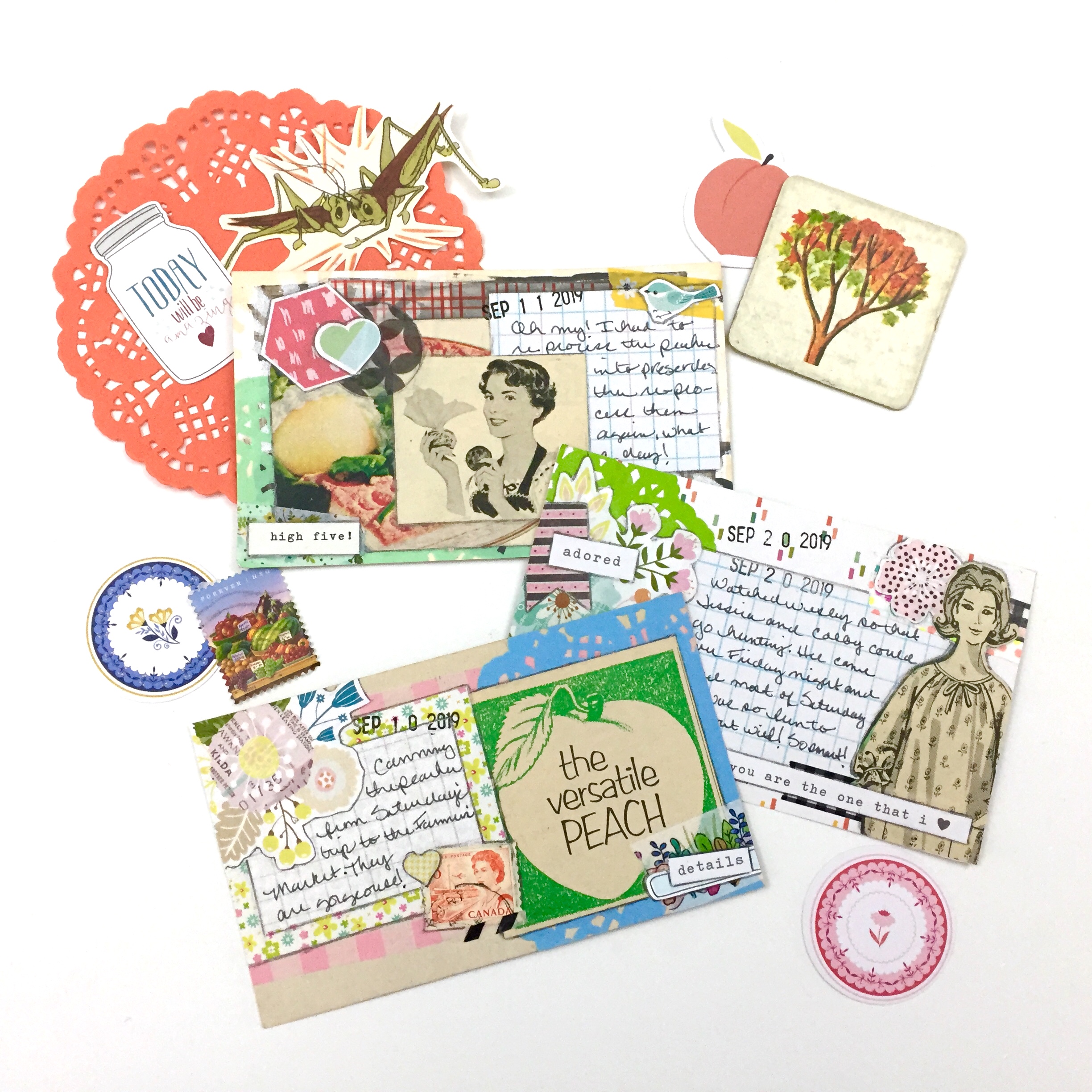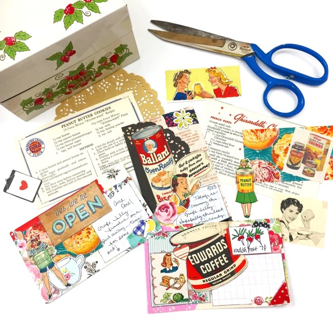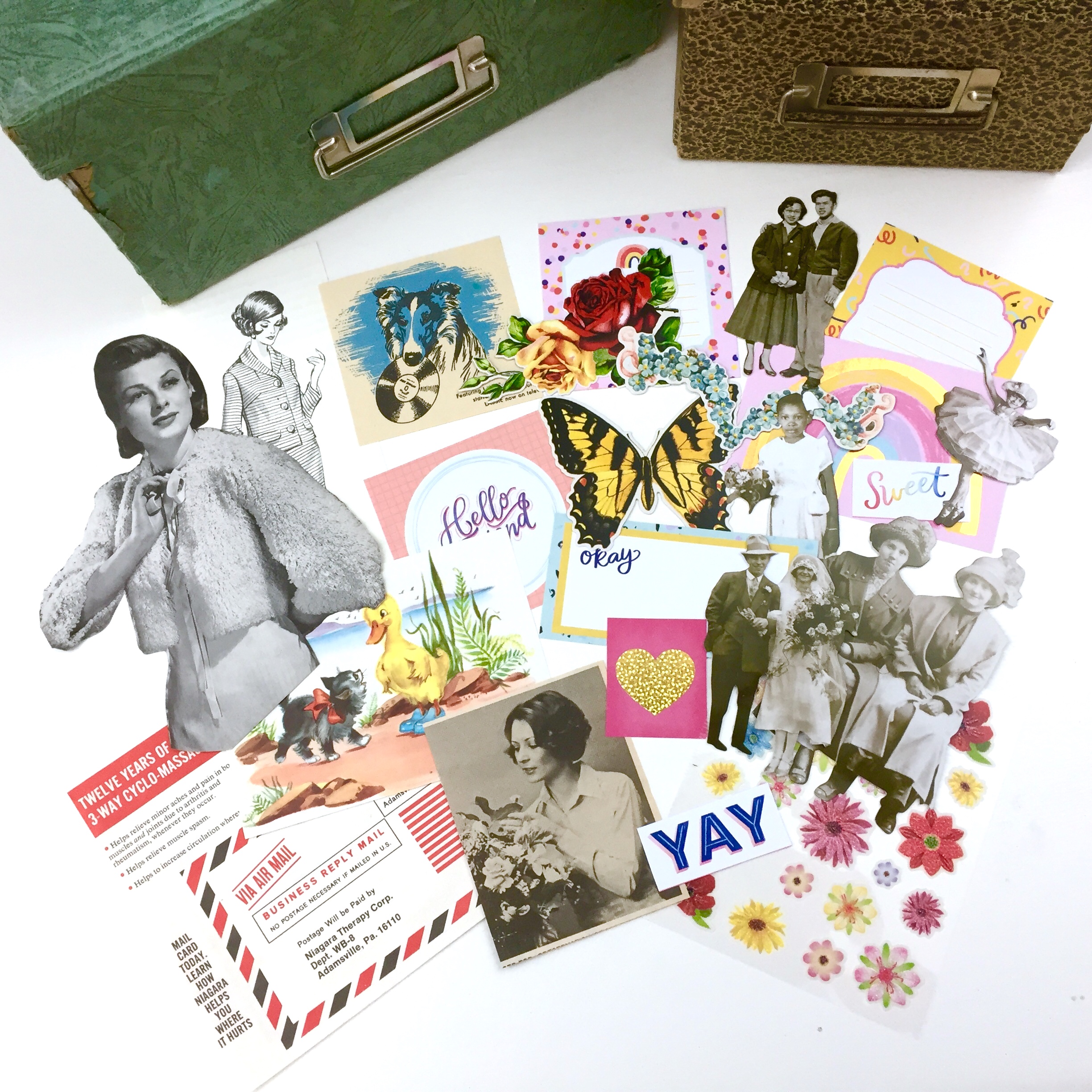 Clockwise from the top: Tim Holtz ephemera from Amazon, mics. paper pad ephemera “Shake It Chic” from Michael’s, stickers from Hobby Lobby, vintage magazine images, and various book images.