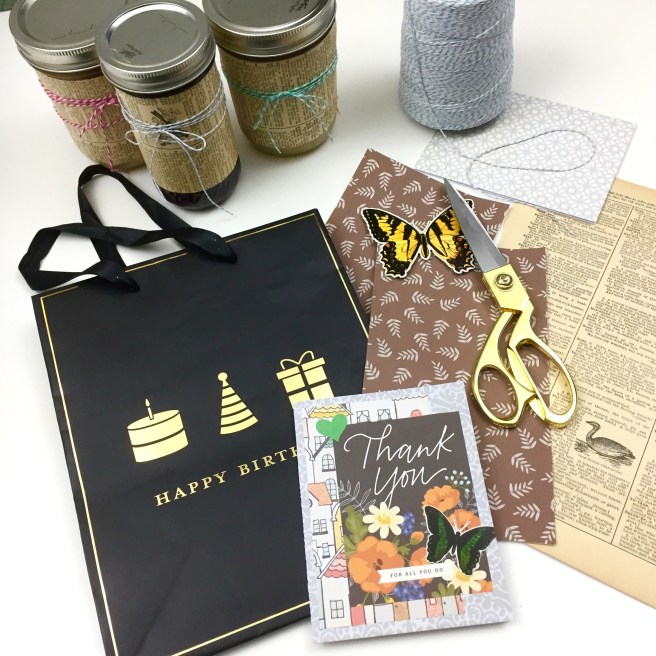 So, I gathered what I could find to cobble this gift, the jars (of course), bakers twine, dictionary pages, and various décor to cover the “Happy Birthday” on the only bag I had.