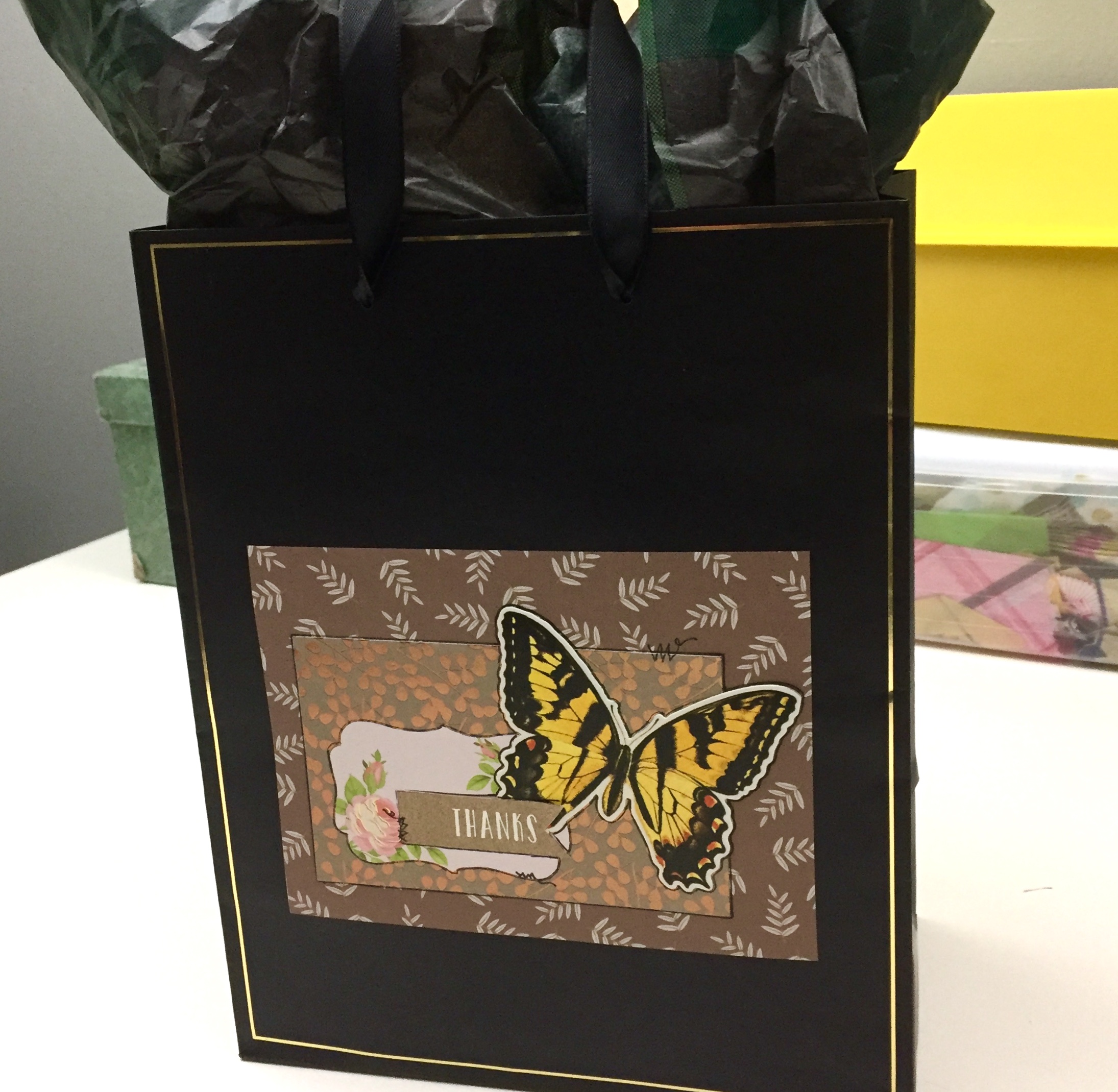 I knew I didn’t want to hassle with trying to adhere paper to that bag, so I printed a design from a scrapbook paper download I had purchased from Etsy onto some sticker paper. Then I found some paper with some metallic designs, a label from Joann’s clearance bins, a Tim Holtz butterfly, and a little wordstrip.