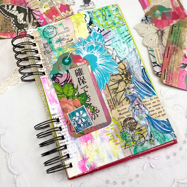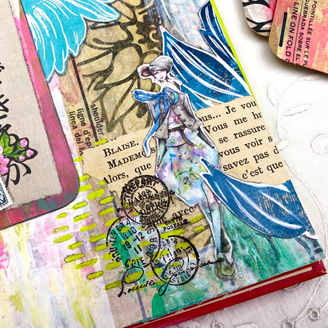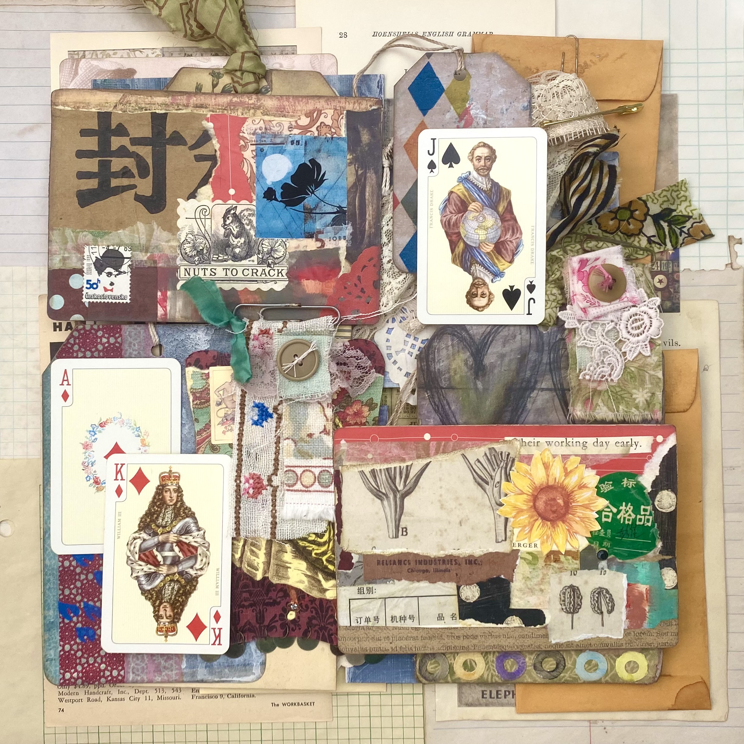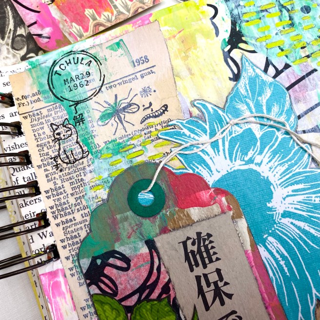 The little gypsy is from a tag journal from many moons ago that can be a journal spot, and I made some pages from another journal into tags. I added some gesso and strategic paper pieces to cover my journaling, but most of them are double sided and have some creative potential.
